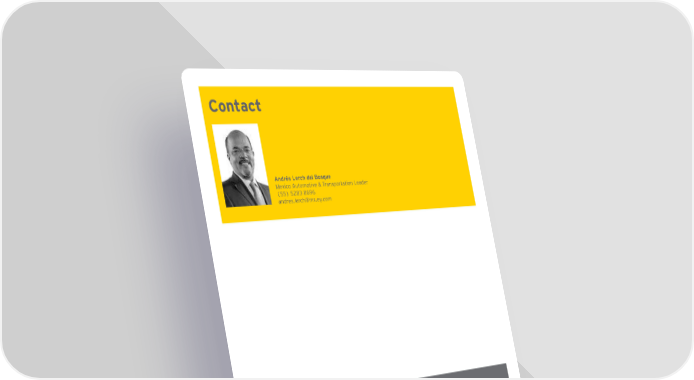 Contact Andrés Lerch del Bosque †exico ‡utomotive Transportation eader —ŠŠ˜ Š‚“’ “…™… andres.lerchšmx.ey.com EY | Assurance | Tax | Transactions | Advisory About EY n line with EY’s commitment to minimie its impact on the EY is a global leader in assurance, tax, transaction and advisory environment, this document has been printed on paper with a services. The insights and quality services we deliver help build trust high recycled content. and confidence in the capital markets and in economies the world This material has been prepared for general informational purposes over. We develop outstanding leaders who team to deliver on our only and is not intended to be relied upon as accounting, tax, or other promises to all of our stakeholders. n so doing, we play a critical role professional advice. –lease refer to your advisors for specific advice. in building a better working world for our people, for our clients and for our communities. ey.com/automotive EY refers to the global organiation, and may refer to one or more, of the member firms of Ernst Young lobal imited, each of which is a separate legal entity. Ernst Young lobal imited, a company limited by guarantee, does not provide services to clients. or more information about our organiation, please visit ey.com. © ‚ƒ„… EY† imited. ‡ll ˆights ˆeserved. EY no. E‰ƒ„Š‹ Œ†Ž ‡gency ‡ ƒƒƒƒ‘ƒŠ„’“ E‰ ”one