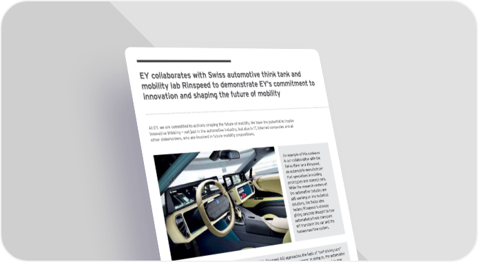 E Y c o l l a b o r a t e s w i t h S w i s s a u t o m o t i v e t h i n k t a n k a n d m o b i l i t y l a b R i n s p e e d t o d e m o n s t r a t e E Y ’ s c o m m i t m e n t t o i n n o v a t i o n a n d s h a p i n g t h e f u t u r e o f m o b i l i t y At EY, we are committed to actively shaping the future of mobility. We have the potential to inspire innovative thinking — not just in the automotive industry, but also in IT, internet companies and all other stakeholders, who are involved in future mobility propositions. An example of this endeavor is our collaboration with the Swiss think tank Rinspeed, an automobile manufacturer that specializes in building prototypes and concept cars. While the research centers of the automotive industry are still working on the technical solutions, the Swiss idea factory Rinspeed is already giving concrete thought to how automated private transport will transform the car and the human-machine system. Swiss automotive visionary Frank M. Rinderknecht (CEO, Rinspeed AG) approaches the topic of “self-driving cars” primarily from the perspective of the driver and the occupants — the human component. In doing so, the automotive thinker and EY expressly put one question on the agenda: how much of a human component should, must or may there be in a machine? Leveraging EY’s trusted consulting services and the support of other partners across the mobility value chain, Rinspeed created its latest hybrid sports car, the Éƺtos$Ê using the sceleton of a :EO i0& The technical highlight in the interior of the ÉƺtosÊ is no doubt the folding and retracting steering wheel. This creates lots of space in front of the driver, who can work or read a book in the old-fashioned way. The ÉƺtosÊ drasticallq reduces the numZer of distracting manual entries È despite significantlq expanded functions. Should it nonetheless be necessarq to enter a command$ the ÉƺtosÊ responds promptly to voice commands, gestures, touch input, controller or the push of a button. Heads up: Σtos has an extremely high addiction and envy factor — future, here I come! 4 | H o w m u c h h u m a n d o w e n e e d i n a c a r ?