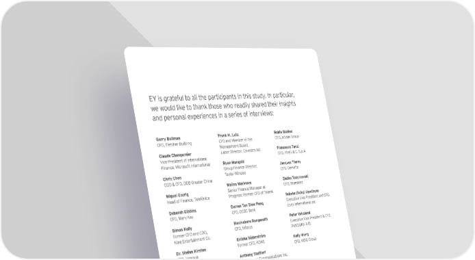 EY is grateful to all the participants in this study. In particular, we would like to thank those who readily shared their insights and personal experiences in a series of interviews: Gerry Bollman Frank H. Lutz Robin Stalker CFO, Fletcher Building CFO and Member of the CFO, adidas Group Management Board, Claude Changarnier Labor Director, Covestro AG Francesco Tanzi Vice President of International CFO, Pirelli & C. S.p.A Finance, Microsoft International Ryan Mangold Group Finance Director, Jacques Tierny Chris Chen Taylor Wimpey CFO, Gemalto COO & CFO, DDB Greater China Malina Marinova Zlatko Todorcevski Miguel Escrig Senior Finance Manager at CFO, Brambles Head of Finance, Telefónica Progress; Former CFO of Telerik Kmc]lm Kmcq!MhY\`qYq Deborah Gibbins