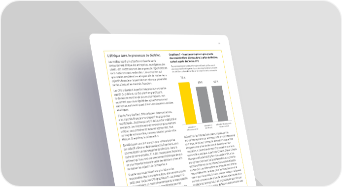 19 L’éthique dans le processus de décision Graphique 7 – Importance de plus en plus grande Les médias ayant une attention croissante sur le des considérations éthiques dans la prise de décision, comportement éthique des entreprises, les exigences des surtout auprès des jeunes CFO clients, des investisseurs et des organes de réglementation Pourcentage des personnes interrogées estimant qu’elles auront en la matière se sont renforcées. Les entreprises qui une responsabilité éthique de plus en plus importante dans le cadre des décisions prises afin de réaliser les objectifs de leur entreprise ignorent les considérations éthiques afin de réaliser leurs objectifs financiers risquent de s’en retrouver pénalisées 78 % par les clients et les marchés financiers. 69 % 69 % Les CFO présentent la performance de leur entreprise auprès du public et, ce rôle allant en grandissant, ils devront se montrer de plus en plus vigilants, non seulement quant à la légalité des agissements de leur entreprise, mais aussi quant à leurs conséquences sociales et éthiques. D’après Tony Staffieri, CFO de Rogers Communications, « les marchés financiers vont devenir de plus en plus sophistiqués. J’estime qu’un CFO doit susciter crédibilité et confiance. Les investisseurs doivent savoir qu’au moment critique, vous prendrez les mesures appropriées. Tout au long de votre carrière, ne compromettez jamais votre Génération Y Génération X Génération du baby boom (39 ans ou moins) (40-49 ans) (50 ans ou plus) éthique. Et exprimez-la clairement. » En définissant un « but » précis pour votre entreprise Aujourd’hui, les informations communiquées par les (un objectif ultime au-delà des objectifs financiers), vous entreprises reposent sur une mesure de la valeur beaucoup pourrez établir un cadre de prise de décisions. Dans le plus large, ce qui leur permet de démontrer le caractère cadre de notre enquête, 71 % des responsables financiers éthique de leur prise de décision et de renforcer leur estiment qu’ils auront une « responsabilité éthique de plus réputation. « L’exercice de reporting ne relève plus de la en plus importante dans le cadre des décisions prises afin conformité », explique Juan Costa Climent, Global Climate de réaliser les objectifs de l’entreprise. » Change and Sustainability Services Leader d’EY. « Les entreprises cherchent à aligner la gestion et la prise de Si cette responsabilité est une priorité pour les décisions internes sur les informations communiquées responsables financiers de tous âges, elle a encore plus de au marché. Les informations déclarées doivent être de poids pour les jeunes CFO (graphique 7). Les jeunes CFO nature différente : la valeur pour les investisseurs et la ont grandi dans un monde économique où la responsabilité valeur pour la société. À moins que ces moteurs ne fassent sociale a pris une importance considérable pour les partie du processus de prises de décision internes (et de la entreprises, alors qu’elles réagissent à la surveillance des stratégie de l’entreprise), il est impossible de garantir que organismes de réglementation, des clients, des employés l’entreprise crée de la valeur de façon durable et selon une et des investisseurs. perspective à long terme. » ey.com/fr/adnducfo