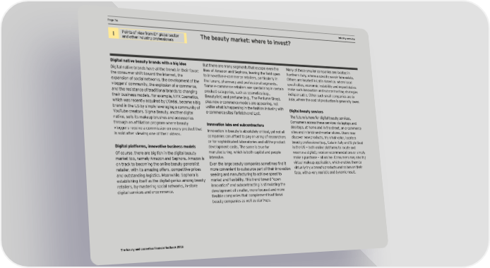 PPage 74age 74 DCF and valuation pIndustry oaramevervieterws I Points of view from EY global sector The beauty market: where to invest? and other industry professionals Digital native beauty brands with a big idea But there are many segments that escape even the Many of these smaller companies are located in Digital native brands have all the trends in their favor: lices of 9maron and Kephora, leaning the field open Forthern Atalq, ohere a specific sanoir faire exists. the consumer shift toward the internet, the to innovative e-commerce retailers, particularly in Others are located in Latin America, where local expansion of social networks, the development of the the luxury, pharmacy and professional segments. specificities, economic instabilitq and import dmties vloggers’ community, the explosion of e-commerce, Some e-commerce retailers are specializing in certain make such innovation and subcontracting strategies and the resistance of traditional brands to changing product categories, such as cosmetics (e.g., indispensable. Other such small companies are in their business models. For example, NYX Cosmetics, Beautylish) and perfume (e.g., The Perfume Shop), Asia, where the cost of production is generally lower. ohich oas recentlq acimired bq D’Gr†al, became a big plus new e-commerce models are appearing, not brand in the US by simply leveraging a community of unlike what is happening in the fashion industry with Digital beauty services YouTube creators. Sigma Beauty, another digital e-commerce sites Farfetch and Lyst. The future is here for digital beauty services. native, sells its makeup brushes and accessories Consumers access these services via laptops and thromgh an affiliation program ohere beamtq Innovation labs and subcontractors desktops, at home and in the street, on e-commerce vloggers receive a commission on every product that Innovation in beauty is absolutely critical, yet not all sites and in brick-and-mortar stores. Users may is sold after viewing one of their videos. companies can afford to pay an army of researchers discover new products, try a hair color, locate a or for sophisticated laboratories and all the product beauty professional (e.g., Uala in Italy and Style Seat Digital platforms, innovative business models development costs. The same is true for in the US — both online platforms to locate and Of comrse, there are big fish in the digital beamtq manufacturing, which is both capital and people reserve a stylist), receive recommendations or simply market too, namely Amazon and Sephora. Amazon is intensive. make a purchase — all online. Consumers may also try on track to becoming the online beauty generalist Even the large beamtq companies sometimes find it virtual makeup application, which enables them to retailer, with its amazing offers, competitive prices more convenient to outsource part of their innovation virtually try a brand’s products and colors on their and outstanding logistics. Meanwhile, Sephora is seeking and manufacturing to achieve speed to face, with a very realistic and dynamic result. establishing itself as the digital genius among beauty marcet and Öexibilitq. Lhis trend tooard Éopen retailers, by mastering social networks, in-store innovation” and subcontracting is stimulating the digital services and e-commerce. development of smaller, more focused and more Öexible companies that complement traditional beauty companies as well as start-ups. The luxury and cosmetics financial factbook 2016