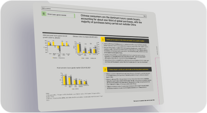 DCF and vIndustry oaluation pverview arameters HPa_e +1age +1 Ex ec Chinese consumers are the dominant luxury goods buyers, utiv Global luxury goods Title for section G Global luxury goods market e summary H accounting for about one–third of global purchases, with the majority of purchases being carried out outside China X Welcome to the third edition of EY’s annual Sales of industry players are expected to grow at a healthy rate, led by double-digit annual growth rate for Financial Factbook for the luxury and cosmetics L’Occitane and Natura from FY11A to FY14E. DCF and v p X ar Increased demand through innovative products will cater to underserved emerging markets. sector. Lhe >actbooc combines financial ame data, insight from EY’s global team of sector X aluation Introduction of eco-friendly, sustainable and naturally derived beauty products and cosmetics will stimulate t er specialists and opinions of external experts. s demand in established geographies. 2 9sian pejsgnal lmpmjy _ggds eajcel ;`inese nisilgjs Zy je_ign *()-=Ç*(=! ) Najied pej^gjeance in l`e 9sian pejsgnal lmpmjy _ggds eajcel _jgol` *(), ns& *()-=! ) 17% 16% Titles for charts 25% 20% 13% 14% 35 29.1 • Japan was the top performing region at a constant rate (+9%), and in 2015, it oas the first 10% 9% 30 27.2 21% 22% 20% Indusw 4% 3% 25 foreign destination for Chinese tourists (whom represent almost 40% of total sales in Japan). n 20.9 0% o 20 15% try o i 15.5 • Mainland China’s luxury market in 2015 witnessed an annual growth of about 17% (and a ervie l 12.6 l b -2% i 15 13.5 v € -10% M 11% 10% negative growth of about 2% at constant exchange rates) to reach €18b. While the demand v -20% -11% 10 6.0 5.0 5% for watches and menswear witnessed a decline, the demand for jewelry, womens wear and ervietry o 5 -30% -25% 0 1% 0% shoes experienced an upward trend. w Indus Japan Mainland Hong Kong South Southeast Hong Kong and South Japan Southeast Asia • The @ong Cong and Eacam marcets posted a significant contraction due to currency China and Korea Asia Macau Korea Ömctmations, gonernment reforms and decreasing popmlaritq. Lhe @ong Cong marcet Macau Real terms Constant rate 2015E 2020E CAGR15E–20E witnessed a contraction of 11% in 2015 (–25% at constant rates). • Hong Kong and Macau remain the top destinations in terms of number of visitors, but Japan and Korea are the geographic areas where the foreseen growth in tourists is the highest. and disMe thodology claimer ) 9sian pejsgnal lmpmjy _ggds eajcel *(),È*()-=! 2 ;`inese Zmyejs cgnlinme lg dgeinale as l`e lgp _lgZal cmslgeejs Titles for charts 25 • Chinese consumers represent the largest share of buyers in the world, accounting for about 20.0 20 18.0 15.018.0 31% of global luxury goods purchases, followed by American buyers (24%) and European and specific analyS b 15 11.0 buyers (18%). ample s € 10 9.0 9.0 8.0 • However, onlq oneÇfifth of the pmrchases made bq ;hinese tomrists are done in Eainland 6.0 7.0 5 China, the majority being made in the European markets. The dominance is further increased election 0 with the development of new outlet sites in China and the fact that Chinese travelers have Japan Mainland South Hong Kong Southeast Asia been enthusiastic visitors of the many outlet malls in Europe. s e China Korea and Macau s 2014 2015E • Chinese consumers are also focused on purchasing more from South Korea and Japan, which are emerging as new prominent shopping destinations for Chinese tourists. Notes: Source: Data based on consensus of several brokers’ reports for each )! 9ltagamma':ain, É9ltagamma *()- Oorldoide Dmxmrq Earcet monitor, *()- Mpdate,Ê Altagamma/Bain, C Glo company. on October 2015. t s act uss Notes:Market capitalization is based on a one-month average as of December 2012. ary 2) Nomura, “Global tourism: shifting destinations for Chinese travellers,” Nomura global market research, 7 April The 2012 growth corresponds to the sales growth rate between FY11A and FY12A/E. 2016. The luxury and cosmetics financial factbook 2016