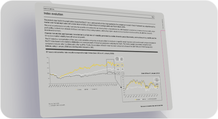 Executive summary Page 5 Index evolution e summary utiv The analysis reported in the graph below shows that the EY luxury and cosmetics index (represented by the companies included in the EY factbook) has outperformed the ec market over the last eight years with a total return of 83%, corresponding to an anerage qearlq significant retmrn of 8%. Ex This relatine performance actmallq illmstrates the appetite of innestors for an indmstrq that is characterired bq solid financial fmndamentals in terms of sales grooth, mabor profitabilitq, resilient international client base and exposmre to grooing marcets, attribmting higher nalmations to companiesÇrelated secmrities, despite the economic instable environment. Financial markets this year have been characterized by a high level of instability generated by a series of events: geopolitical events, commodities pricing volatility and the China stock market volatility have all hampered growth. The EY index is a representation of the lmxmrq and cosmetics companies analqred oithin the factbooc. 9 specific oeight has been attribmted to each companq inclmded in the EY index based on its market capitalization and revenues (each of these two parameters weighing for a half). The relative weights have been revised for each company’s inclusion after its initial public offering (IPO). Finally, the evolution of the EY index has been compared to those of the S&P 500 and STOXX Europe 600 indexes, using 1 January 2008 as a starting date (rebased to 100). =Q lmpmjy and cgseelics indep englmlign cgepajed lg eabgj indices Zase )(( as g^ ) Banmajy *((0! As of 1 250 31 March CAGR 2016 08–16 200 183 8% 150 142 4% 100 94 -1% Zase )(( as g^ ) Banmajy *()-! 50 125 120 As of 1 January 115 2016 0 110 107 Jan 08 Apr 08 Jul 08 Oct 08Jan 09 Apr 09 Jul 09 Oct 09 Jan 10 Apr 10 Jul 10 Oct 10Jan 11 Apr 11 Jul 11 Oct 11 Jan 12 Apr 12 Jul 12 Oct 12 Jan 13 Apr 13 Jul 13 Oct 13Jan 14 Apr 14 Jul 14 Oct 14 Jan 15 Apr 15 Jul 15 Oct 15Jan 16Mar 16 105 102 EY Index S&P 500 Europe 600 100 99 95 90 85 5 5 5 5 5 5 5 15 5 15 15 15 6 1 1 1 1 1 1 1 n b ar r ay 1 n l g p ct v c Ja Fe Ap Ju u e O o e M M Ju A S N D Jan 1 Source: Capital IQ. EY Index S&P 500 STOXX Europe 600 1. Compound annual growth. The luxury and cosmetics financial factbook 2016