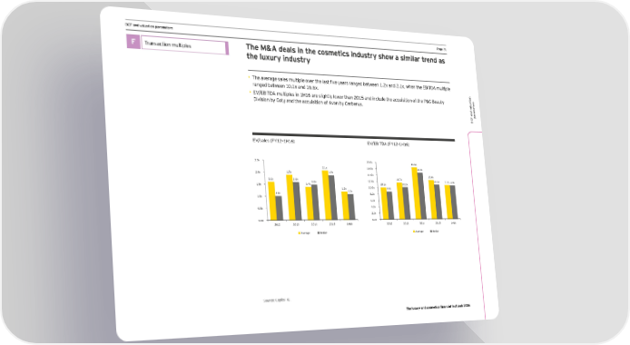DCF and valuation parameters Ha_e +) F Transaction multiples The M&A deals in the cosmetics industry show a similar trend as the luxury industry • Lhe anerage sales mmltiple oner the last fine qears ranged betoeen ).*x and *.)x, ohen the E:AL<9 mmltiple ranged between 10.1x and 16.6x. • EN'E:AL<9 mmltiples in )@). are slightlq looer than *()- and inclmde the acimisition of the H? :eamtq s er Q)*Ç)@).! =N'=:AL<9 >Q)*Ç)@).! 2.5x 18.0x 16.6x 2.1x 16.0x 14.9x 2.0x 1.9x 1.9x 14.0x 12.6x 1.6x 1.6x 12.0x 11.7x 11.1x 11.0x 1.5x 10.1x 10.2x 10.9x 1.5x 1.4x 1.2x 10.0x 8.8x 1.0x 1.1x 8.0x 1.0x 6.0x 0.5x 4.0x 2.0x 0.0x 0.0x 2012 2013 2014 2015 1H16 2012 2013 2014 2015 1H16 Average Median Average Median Source: Capital IQ. The luxury and cosmetics financial factbook 2016