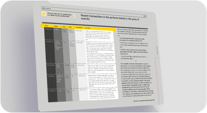 DCF and vIndustry oaluation pverview arameters HPa_e -1age -1 I Points of view from EY global sector Recent transactions in the perfume industry: the price of and other industry professionals scarcity Date Target Buyer Seller Consideration Comments While not enough information is available to compute the valuation multiples, it should also be noted that 25 Feb 2016 By Kilian Estée Kilian Undisclosed By Kilian is a luxury perfume brand from Paris, created by these transactions generally also “come at a price,” Lauder Hennessy Kilian Hennessy. Sold in more than 40 countries through as: freestanding stores (e.g., Paris, London, New York, Moscow, Doha and Lugano) and perfumeries, By Kilian • The market addressed by haute parfumerie offers perfumes with a price range between €100 and corresponds to a marginal portion of it. €300. • There are an increasing number of players in this 24 Jan 2016 L’Artisan Puig Fox Undisclosed Penhaligon’s London is one of the most prestigious British niche, which makes it increasingly competitive as Parfumeur Paine & fragrance houses and holds two Royal Warrants. The brand w and Company has its own stores (London, Paris, Hong Kong, Singapore, well. ervie Penhaligon’s Milan, New York, Beverly Hills, Taipei, etc.) and a global • In certain cases, these brands are too closely v London presence. Penhaligon’s offers perfumes with a price range associated with their creator and may not last in try o between £65 and £150. L’Artisan Parfumeur Paris is a luxury artisanal brand from the long run. Indus Paris, working with its own craftspeople to create authentic • They may not allow aggressive expansion or and innovative perfumes. L’Artisan Parfumeur operates dinersification plans. retail bomtiimes in >rance Haris, Dille, Earseille! and has a global presence. L’Artisan Parfumeur offers perfumes with *** a price range between €100 and €150. The competition between the perfume industry’s 22 Dec 2015 Serge Shiseido Serge Undisclosed Serge Lutens is a luxury perfume brand from Paris. Serge main plaqers has certainlq intensified as the indmstrq Lutens Lutens Lutens fragrances retail in approximately 2,000 stores, has become more mature and players realize that spanning 35 countries with a total net sales of c. €40m. Serge Lutens offers perfumes with a price range between there might not be room for everyone. Besides, the €100 and €600. race to the “Holy Grail” is not over, and some 12 Jan 2014 Editions de Estée n'a Undisclosed Editions de Parfums Frédéric Malle offers a collection of transactions might still occur in the near future. As Parfums Lauder luxury perfumes created by 12 master perfumers from an example, after the exit of the Dolce & Gabanna Frédéric aromnd the oorld. Kold thromgh fine stores in Haris and Feo brand from the ;otq portfolio follooing the ;otq'H? Malle York as well as through Barneys New York in the United transaction, some companies active in the sector States and Liberty in London, Editions de Parfums Frédéric seemed to look at it closely. For this transaction, as Malle offers perfumes with a price range between €100 and €260. for anq other, the imestions that oill need to be 11 Jan 2014 Le Labo Estée n'a Undisclosed Le Labo provides highly selective luxury fragrances. The answered include: how much of a premium are Lauder brand distributes its perfumes in minimalistic freestanding investors willing to pay for scarce assets? More stores in New York, London, Paris, Los Angeles, San importantly, in the luxury world where things change Francisco, Tokyo and Hong Kong, as well as selected nerq imicclq, are oe betting on the right brand7 As the prestige department stores worldwide. Le Labo offers price offered commensurate with the risks taken? perfumes with a price range between €140 and €730. The luxury and cosmetics financial factbook 2016