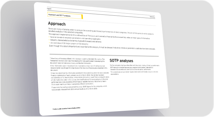 Ha_e 0( Methodology Approach and SOTP analyses Approach Lhere are manq criteria bq ohich to analqre the operating and financial performances of listed companies. Lhe aim of this smrneq is not to condmct a detailed analysis of the selected companies. The approach implemented in this sixth edition of The luxury and cosmetics financial factbook essentially relies on three types of information: • Several standard valuation parameters and operating aggregates • Industry characteristics (in terms of growth forecasts and drivers) • An overview of 30 major players of the industry Even though this data is important and essential to the analysis, it must be stressed that other criteria or parameters could also have been analyzed. The entirety of the data utilized in this factbook is publicly disclosed information. The Transaction Advisory Services (TAS) teams of EY who participated in developing this SOTP analyses docmment hane not had access to anq confidential information. If the information used is found out to be incomplete or incorrect, EY will not be held >or the companies that hane dinersified actinities DNE@, Cering, D’Gr†al!, oe performed a responsible for any impact this may have on the results or the analyses presented in this SOTP analysis to isolate the pure luxury segment and to better understand its document. characteristics as well as its contribution to the companies’ performance. It must be noted that the information provided in this study is based on the latest available This analysis was not possible for Swatch, Beiersdorf and Shiseido as no accurate data financial statements of each companq as at +) Earch *().. Earcet data has been was available. considered as of +) Earch *()., mnless stated otheroise or apart from smbseiment pieces of information inclmded in this smrneq. 9nq modification of the analqred gromp’s financial performances or anq enolmtion of the financial marcets that occmrred since +) Earch 2016 could lead to partially or completely different conclusions. Hlease note that oe hane presented the actmal *()- figmres for the companies, ohich have already released their 2015 annual results as of 31 March 2016. The luxury and cosmetics financial factbook 2016