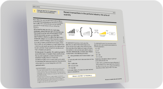 DCF and vIndustry oaluation pverview arameters PPage 57age 57 I Points of view from EY global sector Recent transactions in the perfume industry: the price of and other industry professionals scarcity More often than not, the exact terms and conditions of the licensing agreements are not publicly available, but royalty rates paid by the licensee are typically expected to range between 2% and 10% in this industry. Less protection Discount While licensing deals are still very much being Royalty rate costs and tax rate Value of the developed, some of the main perfume manufacturers trademark 1 Revenues generated Royalties on the trademark Cash Öows attributable have experienced the limits of this business model { { w and are now exploring more, and more often, under the trademark to the trademark ervie opportunities to directly buy either the rights over a v trademark category or an entire trademark, brand or try o business. Another strategy used by industry players Indus is to look for haute parfumerie brand targets. While As depicted in the previous chart, under this To mnderstand the practical conseimences of this the benefits of smch strategies are imite enident from approach, the nalme of the brand is eimal to the approach, let’s tace a simplified example oith the a bmsiness and grooth perspectine, the right imestion stream of after-tax royalty savings associated with following parameters: to ask is whether these transactions are also sound the ownership of the intellectual property (IP) rights • S1 = 100 from a financial perspectine. discounted at a rate commensurate with the risks of • g = 2% To help ansoer this imestion, it is msefml to go bacc to the asset. Eathematicallq, the brand nalme N:rand! • RR = 6% some of the basics of valuation theory and to review is dependent on the following parameters: the valuation approach commonly known as the • S1 = sales generated under the brand name in year • DR = 10% 2 one • TR = 33.33% relief-from-royalty method . In fact, the relief-from-royalty method seems particularly suited • g = annual growth rate of sales associated with the Numerically, this leads to N:rand 5 )((".! " to estimating the value associated with the ownership brand )Ç++.++!' )(Ç*! 5 -( of the rights to a brand intangible asset in the • RR = royalty rate In other words, a perfume brand generating sales of perfume sector. • DR = discount rate 100, growing at 2% per year (into the long term) and for which the licensee pays a royalty rate of 6% has a 1 • TR = tax rate One of the most famous examples of the limits to this business model theoretical, intrinsic value of 50 or 0.5x sales. is arguably the termination of the licensing arrangement between In formmlaic terms, the nalme of an indefinite%lined Burberry and Inter Parfums at the end of 2012. While Inter Parfums receined significant compensation from :mrberrq mpon termination of brand is computed as: the licensing agreement, the former lost approximately 50% of its total sales almost overnight. 2 The basic tenet of the relief-from-royalty method is that without VBrand = ((S1*RR) * (1–TR))/(DR–g) ownership of the subject intangible asset, the user of that intangible asset would have to make a stream of payments to the owner of the asset in retmrn for the rights to mse that asset. :q acimiring the intangible asset, the user avoids these payments. The luxury and cosmetics financial factbook 2016