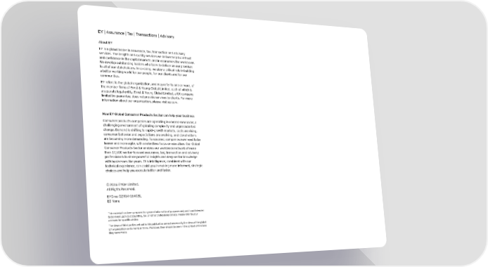EY | Assurance | Tax | Transactions | Advisory About EY EY is a global leader in assurance, tax, transaction and advisory services. The insights and quality services we deliver help build trust and confidence in the capital markets and in economies the world over. We develop outstanding leaders who team to deliver on our promises to all of our stakeholders. In so doing, we play a critical role in building a better working world for our people, for our clients and for our communities. EY refers to the global organization, and may refer to one or more, of the member firms of Ernst & Young Global Limited, each of which is a separate legal entity. Ernst & Young Global Limited, a UK company limited by guarantee, does not provide services to clients. For more information about our organization, please visit ey.com. How EY Global Consumer Products Sector can help your business Consumer products companies are operating in a brand–new order, a challenging environment of spiraling complexity and unprecedented change. Demand is shifting to rapid–growth markets, costs are rising, consumer behavior and expectations are evolving, and stakeholders are becoming more demanding. To succeed, companies now need to be leaner and more agile, with a relentless focus on execution. Our Global Consumer Products Sector enables our worldwide network of more than 17,500 sector–focused assurance, tax, transaction and advisory professionals to share powerful insights and deep sector knowledge with businesses like yours. This intelligence, combined with our technical experience, can assist you in making more informed, strategic choices and help you execute better and faster. © 2016 EYGM Limited. All Rights Reserved. EYG no: 02904‑164GBL ED None This material has been prepared for general informational purposes only and is not intended to be relied upon as accounting, tax, or other professional advice. Please refer to your advisors for specific advice. The views of third parties set out in this publication are not necessarily the views of the global EY organization or its member firms. Moreover, they should be seen in the context of the time they were made.