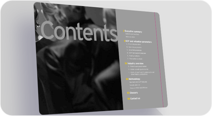 2 Executive summary Statistics and key facts Index evolution Contents 8 DCF and valuation parameters A. Financial parameters B. Operating aggregates C. Advertising expenses D. SOTP and segment analyses E. Trading multiples F. Transaction multiples 36 Industry overview G. Global luxury goods market H Global cosmetic goods market I. Points of view from EY global sector and other industry professionals 80 Methodology Approach and SOTP analyses Sample selection Focus on YOOX Net–A–Porter 83 Glossary Contact us 84