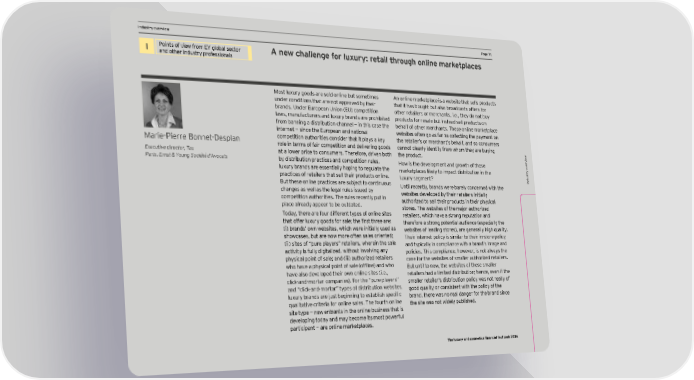 DCF and vIndustry oaluation pverview arameters HPa_e /)age /) I Points of view from EY global sector A new challenge for luxury: retail through online marketplaces and other industry professionals Most luxury goods are sold online but sometimes An online marketplace is a website that sells products under conditions that are not approved by their that it has bought but also broadcasts offers for brands. Under European Union (EU) competition other retailers or merchants, i.e., they do not buy laws, manufacturers and luxury brands are prohibited products for resale but instead sell products on from banning a distribution channel — in this case the behalf of other merchants. These online marketplace internet — since the European and national websites often go as far as collecting the payment on Marie-Pierre Bonnet-Desplan competition authorities consider that it plays a key the retailer’s or merchant’s behalf, and so consumers role in terms of fair competition and delivering goods cannot clearly identify from whom they are buying w Executive director, Tax at a lower price to consumers. Therefore, driven both the product. Paris, Ernst & Young Société d’Avocats by distribution practices and competition rules, ervie How is the development and growth of these v luxury brands are essentially hoping to regulate the marketplaces likely to impact distribution in the try o practices of retailers that sell their products online. luxury segment? Indus But these online practices are subject to continuous Until recently, brands were barely concerned with the changes as well as the legal rules issued by websites developed by their retailers initially competition authorities. The rules recently put in authorized to sell their products in their physical place already appear to be outdated. stores. The websites of the major authorized Today, there are four different types of online sites retailers, which have a strong reputation and that offer lmxmrq goods for sale3 the first three are2 therefore a strong potential audience (especially the (i) brands’ own websites, which were initially used as oebsites of leading stores!, are generallq high imalitq. showcases, but are now more often sales oriented; Their internet policy is similar to their in-store policy (ii) sites of “pure players” retailers, wherein the sale and typically in compliance with a brand’s image and activity is fully digitalized, without involving any policies. This compliance, however, is not always the physical point of sale; and (iii) authorized retailers case for the websites of smaller authorized retailers. oho hane a phqsical point of sale ofÖine! and oho But until to now, the websites of these smaller have also developed their own online sites (i.e., retailers had a limited distribution; hence, even if the click-and-mortar companies). For the “pure players” smaller retailer’s distribution policy was not really of and “click-and-mortar” types of distribution websites, good imalitq or consistent oith the policq of the lmxmrq brands are bmst beginning to establish specific brand, there was no real danger for the brand since imalitatine criteria for online sales. The fourth online the site was not widely published. site type — new entrants in the online business that is developing today and may become its most powerful participant — are online marketplaces. The luxury and cosmetics financial factbook 2016