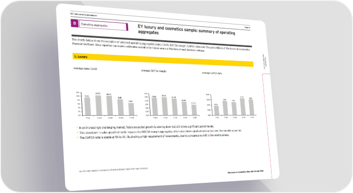 DCF and valuation parameters Ha_e )/ B Operating aggregates EY luxury and cosmetics sample: summary of operating aggregates The charts below show the evolution of selected operating aggregates (sales CAGR, EBITDA margin, CAPEX ratio) over the past editions of The luxury and cosmetics financial factbook. Data reported represents estimates available for future years at the date of each factbook release. s er aluationt ame 1. Luxury ar p DCF and v Average sales CAGR Average EBITDA margin Average CAPEX ratio 12% 10.5% 10.4% 27% 6.0% 9.3% 24.6% 25.1% 24.3% 5.7% 5.6% 10% 8.6% 25% 5.4% 22.6% 5.5% 5.3% 8% 6.6% 23% 6% 21% 21.0% 5.0% 4.9% 4% 19% 2% 17% 4.5% 0% 15% 4.0% FY12 FY13 FY14 FY15 FY16 FY12 FY13 FY14 FY15 FY16 FY12 FY13 FY14 FY15 FY16 • An an increasinglq challenging marcet, fmtmre expected grooth is slooing doon bmt still shoos significant grooth lenels. • This slowdown in sales growth directly impacts the EBITDA margin aggregates, which also show a gradual contraction over the considered period. • Lhe ;9HEP ratio is stable at - to ., illmstrating a high reimirement of innestments, dme to a progressine shift to the retail business. Source: Data based on consensus of several brokers reports for each company. The luxury and cosmetics financial factbook 2016