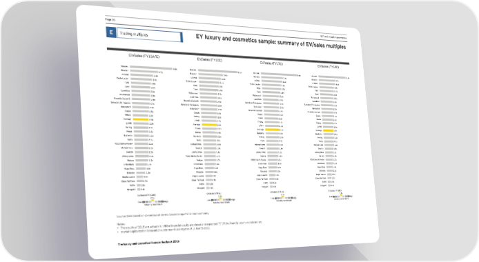 Page 26 DCF and valuation parameters E Trading multiples EY luxury and cosmetics sample: summary of EV/sales multiples =N'sales >Q)-9'=! =N'sales >Q).=! =N'sales >Q)/=! =N'sales >Q)0=! Heje†s .&.p Heje†s .&)p Heje†s -&.p Heje†s -&+p Mgnclej ,&+p Mgnclej +&0p Mgnclej +&,p Mgnclej +&)p DGj†al +&-p DGj†al +&,p DGj†al +&*p DGj†al +&)p =sl†e Damdej +&+p =sl†e Damdej +&)p =sl†e Damdej +&(p =sl†e Damdej *&0p Lmei +&(p ;gly +&(p ;gly *&1p ;gly *&/p ;gly *&1p Lmei *&1p Lmei *&0p Lmei *&-p Dmpgllica *&0p Jic`eegnl *&/p Jic`eegnl *&.p Jic`eegnl *&-p Jic`eegnl *&0p Dmpgllica *&.p Dmpgllica *&,p Dmpgllica *&+p :jmnellg ;mcinelli *&0p :jmnellg ;mcinelli *&-p Kalnalgje >ejja_aeg *&,p Kalnalgje >ejja_aeg *&+p Kalnalgje >ejja_aeg *&/p Kalnalgje >ejja_aeg *&-p :eiejsdgj^ *&,p :eiejsdgj^ *&*p :eiejsdgj^ *&.p :eiejsdgj^ *&-p :jmnellg ;mcinelli *&+p :jmnellg ;mcinelli *&*p ;gac` *&-p ;gac` *&+p ;gac` *&+p ;gac` *&)p Li^^any *&+p Li^^any *&+p Hjada *&*p Hjada *&(p 9neja_e 2.+p DNE@ *&*p Li^^any *&)p Li^^any *&(p DNE@ 2.+p 9neja_e *&*p DNE@ *&)p DNE@ *&(p Cejin_ 2.*p Hjada 2.*p 9neja_e *&)p 9neja_e )&1p Hjada 2.*p Cejin_ *&)p :mjZejjy *&(p :mjZejjy )&1p :mjZejjy *&*p :mjZejjy *&)p Cejin_ *&(p Cejin_ )&1p Lgds 2.)p Lgds *&(p Lgds )&1p Lgds )&0p QGGP Fel%9%Hgjlej 2.)p Eic`ael Cgjs *&(p Eic`ael Cgjs )&1p Eic`ael Cgjs )&0p Eic`ael Cgjs *&(p Koalc` )&1p Koalc` )&0p Koalc` )&.p Koalc` *&(p Bieey ;`gg )&0p Bieey ;`gg )&.p Bieey ;`gg )&-p Bieey ;`gg *&(p QGGP Fel%9%Hgjlej )&/p Falmja )&.p Falmja )&,p Falmja )&1p Falmja )&/p QGGP Fel%9%Hgjlej )&-p QGGP Fel%9%Hgjlej )&+p DGccilane )&/p DGccilane )&.p DGccilane )&,p DGccilane )&+p @m_g :gss 1.,p @m_g :gss 1.,p @m_g :gss )&+p @m_g :gss )&*p K`iseidg 1.3p K`iseidg )&*p K`iseidg )&*p K`iseidg )&)p Jalp` Damjen )&(p Jalp` Damjen )&(p Jalp` Damjen (&1p Jalp` Damjen (&1p ;`go Lai >ggc 0.9p ;`go Lai >ggc 0.9p ;`go Lai >ggc (&0p ;`go Lai >ggc (&/p Kafilg (&-p Kafilg (&-p Kafilg (&-p Kafilg (&-p @en_deli (&,p @en_deli (&,p @en_deli (&,p @en_deli (&,p =N'sales >Q)-9'=! =N'sales >Q).=! =N'sales >Q)/=! =N'sales >Q)0=! *&+p *&*p *&)p )&1p Dgo Hi_h Dgo Hi_h Dgo Hi_h Dgo Hi_h Indmsljy Zencheajc Indmsljy Zencheajc Indmsljy Zencheajc Indmsljy Zencheajc Source: Data based on consensus of several brokers reports for each company. Notes: • Lhe resmlts of *()- are actmal É9Ê! if the financial resmlts are closed and expected ÉEÊ! if the financial qear is not closed qet. • Market capitalization is based on a one-month average as of 31 March 2016. The luxury and cosmetics financial factbook 2016