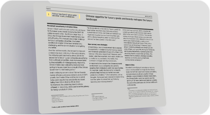 PPage 64age 64 DCF and valuation pIndustry oaramevervieterws I Points of view from EY global sector Chinese appetite for luxury goods and brands reshapes the luxury and other industry professionals landscape Persistent uncertainty in Greater China The deceleration in consumption of luxury goods has As for most luxury groups, watch companies are Greater China4 been fmrther amplified since *(), amid protests currently prioritizing reducing their stock levels in used to be seen as the only safe haven for European luxury brands following the 2007–08 against Mainland China. Anti-Mainland sentiment has order to improve inventory rotation. They are also global economic crisis — but it is no longer true. In negatively impacted tourism from China Mainland, taking advantage of lower pressure on real estate 2012, the Chinese Government implemented a new while a strong Hong Kong dollar has faded out the prices to renegotiate rents. Meanwhile, they pursue anti-gift policy. This measure was a major challenge demand for luxury goods in that city-state.8 online sales implementation as well as store for luxury companies: since then, the market rationalization throughout Greater China, with a 12 conditions in Greater China have remained very New normal, new strategies special focus on Hong Kong. Moreover, luxury challenging, and the current situation is not getting Unsurprisingly, luxury brands remain highly exposed groups’ marketing strategies are changing as well: any better. to uncertainty in Greater China: for instance, Swatch some of them, smch as DNE@, Cering and Jichemont, Over the last few months, the demand for high-end and Richemont generated 34% and 24% of their 2015 are focusing their efforts on promoting the most products has been shrinking. In the watch industry, 9 promising recent brands in their portfolios. This revenue in this area, respectively. However, due to enables them to drastically decrease marketing the mid-price point declined by almost 20% in the weaker sales than expected, most watch retailers are expenses by avoiding onerous traditional second half of 2015.5 Luxury companies are suffering currently facing overstocks. Meanwhile, they 13 from cutthroat competition, even more exacerbated continue to struggle with high rental costs. communication campaigns. by the availability of midrange brands. Meanwhile, In response to the change in the Chinese economic China’s middle class is allocating more and more environment, luxury companies are currently Made in China savings to house properties as a result of the Chinese adapting their strategies to catch new opportunities. But what if intensifying ad campaigns or reducing 6 Government’s credit easing policy. For example, Swatch decided not to increase its costs is not the solution to invigorate the Chinese Amid continming concerns abomt ;hinese financial prices to keep the focus on market share and luxury market? More and more investors are betting marcet efficiencq and gross domestic prodmct ?