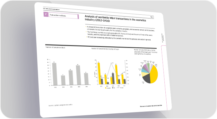 DCF and valuation parameters Page 33 F Transaction multiples Analysis of worldwide M&A transactions in the cosmetics industry (2012–1H16) • As shown in the number of completed deals sorted by geography, and account for almost half of total deals, US remains the top target country for the cosmetics industry. • Lhe first three comntries bq target geography (US, France and Italy) are the same of those of the luxury s er industry, and they represent 68% of total transactions. aluationt ame ar • PE funds are increasingly attracted by the cosmetic market and the personal care sector in general. p DCF and v FmeZej g^ cgepleled deals FmeZej g^ cgepleled deals Zy lype g^ Zmyej FmeZej g^ cgepleled deals sgjled Zy _eg_jap`y g^ l`e laj_el gnej >Q)*Ç)@). aegn_ l`e lgp )( cgmnljies! 45 35 70% Australia Spain China 31 4% 4% 4% Canada 40 39 62% Germany 4% 30 28 60% 5% United 35 35 UK States 25 50% 5% 41% 30 S. Korea 26 6% 25 20 40% s 21 l 16 33% a e 20 d 14 14 15 30% 17 f Italy o . 20% 15 o 21% 8% N 10 10 8 18% 20% 10 7 7 5 5 3 10% France 0 0 0% 19% 2012 2013 2014 2015 1H16 2012 2013 2014 2015 1H16 Corporate PE PE/total Sources: Capital IQ, Mergermarket, Factiva. The luxury and cosmetics financial factbook 2016