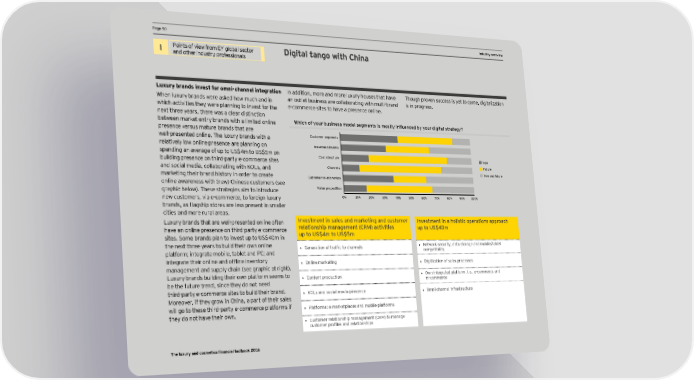 HHa_e -(a_e -( DCF and valuation pIndustry oaramevervieterws I Points of view from EY global sector Digital tango with China and other industry professionals Luxury brands invest for omni‑channel integration In addition, more and more luxury houses that have Though proven success is yet to come, digitalization When luxury brands were asked how much and in an outlet business are collaborating with multi-brand is in progress. which activities they were planning to invest for the e-commerce sites to have a presence online. next three years, there was a clear distinction between market entry brands with a limited online O`ic` g^ ygmj Zmsiness egdel se_eenls is egslly inÖmenced Zy ygmj di_ilal sljale_y7 presence versus mature brands that are well-presented online. The luxury brands with a Customer segments relatively low online presence are planning on Revenue streams spending an average of up to US$4m to US$5m on Cost structure building presence on third-party e-commerce sites Now and social media, collaborating with KOLs, and Channels Future marketing their brand history in order to create Now and future Customer relationships online awareness with (new) Chinese customers (see graphic below). These strategies aim to introduce Value proposition new customers, via e-commerce, to foreign luxury 0% 10% 20% 30% 40% 50% 60% 70% 80% 90% 100% brands, as Öagship stores are less present in smaller cities and more rural areas. Luxury brands that are well-presented online often Annesleenl in sales and eajcelin_ and cmslgeej Investment in a holistic operations approach have an online presence on third-party e-commerce jelaligns`ip eana_eeenl ;JE! aclinilies mp lg MK,(e sites. Some brands plan to invest up to US$40m in up to US$4m to US$5m the next three years to build their own online • ?eneration of traffic to channels • Fetoorc secmritq, data storage and mobile'tablet platform; integrate mobile, tablet and PC; and compatibility integrate their online and ofÖine innentorq • Online marketing • Digitization of sales processes management and supply chain (see graphic at right). Luxury brands building their own platform seems to • Content production • Own integrated platform, i.e., e-commerce and be the future trend, since they do not need m-commerce third-party e-commerce sites to build their brand. • KOLs and social media presence • Omni-channel infrastructure Moreover, if they grow in China, a part of their sales will go to these third-party e-commerce platforms if • Platforms: e-marketplaces and mobile platforms they do not have their own. • Customer relationship management (CRM) to manage cmstomer profiles and relationships The luxury and cosmetics financial factbook 2016
