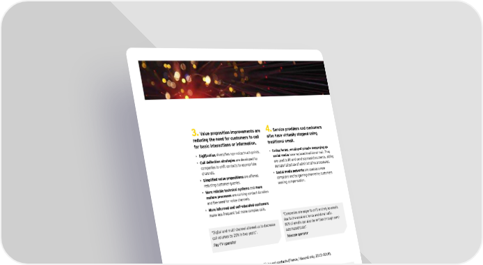 3. V alue p rop osition imp rov ements are 4. S erv ice p rov iders and customers reducing th e need f or customers to call alike h av e v irtually stop p ed using f or b asic interactions or inf ormation. traditional email. • D igitiz ation diversifies non-voice touch points. • O nline f orms, email and p riv ate messaging on • Call deflection strategies are developed by social media have replaced traditional mail. They companies to shift contacts to appropriate are used to fill and send scanned documents, aiding channels. dematerialization of administrative procedures. • Simplified value propositions are offered, • S ocial media netw orks are used as a new reducing customer queries. complaint and bargaining channel by customers • More reliab le tech nical sy stems and more seeking compensation. mature p rocesses are curbing contact duration and the need for voice channels. • More inf ormed and self -educated customers make less frequent but more complex calls. “Companies are eager to shift entirely to emails due to the excellent ‘once and done’ ratio. “Digital and multi-channel allowed us to decrease 80% of emails can also be written through semi- call volumes by 20% in two years”. automated tools”. P ay- TV operator Telecom operator C ase study : F orecast evolution of customer contact channel mix b y share of inb ound contacts ( F rance, inb ound only , 2 015- 2 019 ) . 100% V oice ►Increased push for emails w ith automation and parsing methods 35% for b asic q uestions. 30% ►S trong development of chat. Chat ►S trong reduction in calls 2 5% thanks to avoidance strategies 2 0% and grow th of digital channels. 15% 10% email 5% 0% S ocial Media 2 015F 2 016 F 2 017 F 2 018 F 2 019 F Sources: EY forecasts and analysis O ff- site Customer R elationship S tudy | J anuary 2 016 5