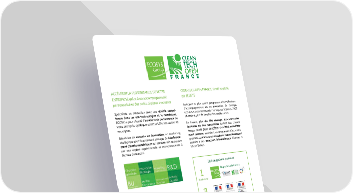 ACCÉLÉRER LA PERFORMANCE DE VOTRE CLEANTECH OPEN FRANCE, fondé et piloté ENTREPRISE grâce à un accompagnement par ECOSYS personnalisé et des outils digitaux innovants Participez au plus grand programme d’identification, Spécialiste en innovation avec une double compé- d’accompagnement et de promotion de startups tence dans les éco-technologies et le numérique, éco-innovantes au monde : 35 pays participants, 7000 ECOSYS a pour objectif d’améliorer la performance de alumnis et plus de 2 milliards de dollars levés. votre entreprise quels que soient sa taille, son secteur et En France, plus de 100 startups éco-innovantes ses enjeux. lauréates de nos partenaires tentent leur chance Bénéficiez de conseils en innovation, en marketing chaque année pour bénéficier d’un label mondiale- stratégique et en financement ainsi que du développe- ment reconnu, accéder à un programme d’accompa- ment d’outils numériques sur mesure, mis en oeuvre gnement sur mesure pour accélérer leur croissance et par une équipe expérimentée et entrepreneuriale à accéder à des concours internationaux (Europe et l’écoute du marché. Silicon Valley). Un écosystème puissant 1 En partenariat avec Fondateur DEVELOPPEZ VOS ECOSYSTEMES 3 Avec son approche collaborative, innovante et en réponse à un besoin permanent d’optimisation Ministères français «faire mieux avec moins», ECOSYS développe vos parrains écosystèmes et vous connecte aux acteurs de votre réseau en France et à l’international. 7 Partenaires Financiers français et européens + 50 partenaires nationaux et régionaux : concours et prix, pôles de compétitivité, incubateurs ECOSYS 68 rue du Faubourg Saint-Honoré - 75008 PARIS www.ecosysgroup.com - [email protected] - 01 53 43 27 66 Cleantech Open France www.ctofrance.com - [email protected] - 01 53 43 62 09