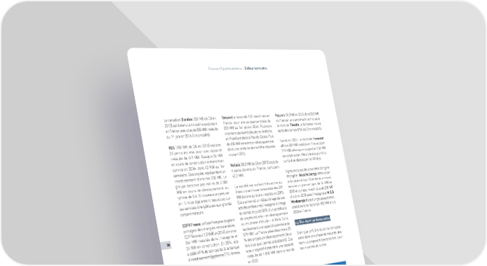 Focus sur 8 grands secteurs - Eolien terrestre Le canadien Boralex (324 M$ de CA en Ostwind a raccordé 120 machines en Futuren (59,2 M€ en 2015, dont 23,3 M€ 2015) est devenu le troisième exploitant France, pour une puissance totale de en France), anciennement connu sous en France, avec plus de 500 MW installés 255 MW au 1er janvier 2016. Plusieurs le nom de Theolia, a fait peau neuve au 1er chantiers devraient débuter en Ardèche, après des temps difficiles (lire encadré). janvier 2016 (lire encadré). en Picardie et dans le Pas-de-Calais. Plus RES (180 M€ de CA en 2015) exploite de 400 MW seraient en développement, Fondé en 2001, le nordiste Innovent 23 parcs éoliens pour une capacité dont une centaine devrait être déposée affiche 287 MW installés en France (dont installée de 449 MW. Quelque 54 MW courant 2016. 119 MW détenus en propre) et 110 MW en cours de construction entreront en en construction. Mais il veut aujourd’hui service en 2016, dont 42 MW au 1er Voltalia (58,5 M€ de CA en 2015) exploite surtout se développer en Afrique. semestre. Ces projets représentent un 4 parcs éoliens en France, cumulant investissement d’environ 200 M€. Le 42,2 MW. Signalons aussi deux sociétés d’origine groupe annonce pas moins de 2 000 étrangère : Velocita Energy, détenue par MW en cours de développement, au La société est surtout très active au le fonds américain Riverstone, a mis en rythme de 5 à 10 nouveaux projets par Brésil où se trouve l’ensemble des 231 service un premier parc de 14 MW en an. Il mise également beaucoup sur MW éoliens qu’elle a installés en 2015. 2015 et compte investir plus de 250 M€ les services énergétiques aux grands Elle a annoncé un rééquilibrage de ses d’ici à mi-2018 dans l’Hexagone et W.E.B consommateurs. activités en faveur de l’Hexagone, à l’image Windenergie, filiale d’un groupe autrichien, du rachat, en juillet 2015, d’un portefeuille ambitionne de raccorder 100 MW d’ici à EDPR France, la filiale française du géant de projets éoliens – en développement 2020 en France. portugais des énergies renouvelables, ou en phase d’étude – à Maïa Eolis, EDP Renovais (1,2 Md€ en 2014), annonce représentant une capacité potentielle de 2.3 Des start-up innovantes 38 364 MW installés dans l’Hexagone et 379 MW. La France pèse désormais 22 24 MW en construction. En 2014, elle % des projets en développement (deux Bien que la filière éolienne terrestre a cédé 49 % de son capital à la banque fois plus que l’année précédente). Elle entre dans une phase de maturité, des d’investissement égyptienne EFG Hermes. a pour objectif d’atteindre une capacité start-up proposent des solutions pour installée de 1 000 MW dans le monde des marchés de niches. en 2022. Panorama des Cleantech 2016