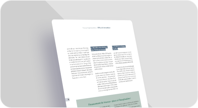 Focus sur 8 grands secteurs - Efficacité énergétique partie de son marché avec Stimergy 3.4 Nouvelles mises de fonds 3.5 Les bureaux d’études et Qarnot Computing (lire encadré) dans l’éclairage économe s’étoffent qui conduisent la chaleur numérique vers l’eau sanitaire ou le chauffage des Echy a levé près de 1 M€ en 2015 auprès Les start-up technologiques ne sont bâtiments. Par l’intermédiaire de son de family offices et business angels et pas les seules à parier sur le marché fonds corporate Aliad, Air Liquide a pris prépare un troisième tour cette année. La de l’efficacité énergétique. Les bureaux en septembre 2015 une participation start-up francilienne collecte la lumière d’études aussi. Témoin le groupe Nepsen, minoritaire dans Orcan Energy. Cette extérieure grâce à un panneau composé qui a racheté ECIC et Transénergie. Son jeune entreprise bavaroise de 50 salariés de lentilles de Fresnel fixé sur un tracker chiffre d’affaires passe de 6,8 M€ à 10 M€. commercialise des solutions modulaires de et la conduit à l’intérieur du bâtiment par génération d’électricité à partir de chaleur la fibre optique. Ou encore le bureau de contrôle Qualigaz résiduelle. Elle annonce avoir vendu 25 qui va intégrer dans sa filiale Evonia le machines de 20 kW en Allemagne, au Aledia a collecté la bagatelle de 28,4 M€ très créatif bureau d’études Cardonnel Royaume-Uni et en Italie. auprès, notamment, de deux industriels Ingénierie. Autre mouvement notable, la et clients potentiels : l’équipementier société de services en développement automobile Valeo et Ikea GreenTech, durable GreenFlex a repris le rennais le fonds de capital-risque du groupe Ordifluides, spécialisé dans l’industrie, suédois. Cette jeune société grenobloise le tertiaire et l’habitat collectif. développe la technologie LED 3D, à base de micro-fils, fabriquée sur des substrats en silicium de large diamètre (200 mm). 74 Financement de travaux : place à l’imagination ! Le dernier frein réglementaire pour les sociétés de tiers (Organic Rankine Cycle). La décharge de Septèmes- 11 financement a été levé par un arrêté du 8 février 2016 . Les-Vallons (13), gérée par Veolia, sert de pilote. Il fixe à 25 % le seuil d’économies d’énergie à atteindre à Le groupe Aqua a restructuré FrancEnergies, bureau dans le cadre de ce mécanisme, par rapport à la d’études et installateur d’équipements, dont il consommation initiale. Mais plusieurs professionnels ne est propriétaire depuis janvier 2016 et le dote de l’ont pas attendu pour construire leurs premières offres. solutions commerciales avec tiers financement. à Le cabinet de conseil dédié à la performance à La Banque européenne d’investissement (BEI) énergétique pour l’industrie, Okavango Energy, propose des prêts aux sociétés régionales de tiers a lancé dès mai 2015 son offre Kubango. Elle financement déployant un programme d’efficacité propose jusqu’à 20 % d’économies aux PME et ETI énergétique dans les bâtiments résidentiels. Le sans creuser l’endettement ou réclamer de fonds montant de son enveloppe pourra aller jusqu’à 400 propres. M€. à L’investisseur Smart Energies s’essaie au tiers financement avec Aqylon, fabricant de turbines ORC 11 Le décret du 25 novembre 2015, pris en application de la LTE, stipule que les sociétés publiques de tiers financement peuvent avancer le montant des travaux aux particuliers qui s’engagent dans la rénovation énergétique de leur logement. Ces sociétés gèrent l’opération de la conception des travaux jusqu’à leur réalisation, en intégrant le financement. Panorama des Cleantech 2016