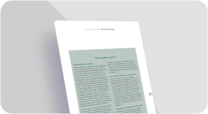 Focus sur 8 grands secteurs - Efficacité énergétique Trois sociétés à suivre Enertime prend son envol L’entreprise a bouclé en 2015 une troisième levée de Créée en 2008, cette entreprise francilienne spécialisée fonds de 1,3 M€. Cette année, c’est d’un montant dix dans la récupération de chaleur issue de l’industrie a fois supérieur dont elle a besoin. Enertime se prépare mis au point de puissantes centrales électrique appelée à entrer en Bourse, ce qui permettrait de «libérer» ses ORC (Organic Rankin Cycle, transformation de la investisseurs historiques Amundi Private Equity, Siparex chaleur à partir de 90° C en électricité, plusieurs MW et Calao Finance. de puissance). Elle voit enfin aujourd’hui ses efforts Du radiateur numérique au smart home récompensés. Au plan commercial en particulier, grâce à la signature de deux importants contrats en Chine en Qarnot Computing, l’inventeur des radiateurs 2015, avec les aciéristes Shanghai Baosteel et Baotou numériques, a levé 21,5 M€ auprès du constructeur et Steel. « Les machines sont conçues et fabriquées en exploitant d’entrepôts de données Data4, détenu par France et seront livrées en juin et septembre de cette le fonds américain Colony Capital, en 2015. La société année. Le premier contrat atteint 2 M€, le deuxième réalise 1 M€ de chiffre d’affaires et a déjà installé se situe autour de 500 000 € », annonce Gilles David, 400 ordinateurs de chauffage nommés Q.rad. Elle cofondateur et président d’Enertime. Il prévoit de compte accélérer son développement technologique nouvelles affaires dans ce pays à fort potentiel : « La et recruter des commerciaux, notamment pour le Chine, c’est la moitié de l’acier mondial mais aussi un marché américain. Elle peaufine une V2 du Q.rad, pays confronté à une forte pollution. Nos machines y équipée de capteurs et fonctionnalités communicantes suscitent un grand intérêt, car elles évitent de produire pour mesurer la qualité de l’air, détecter la présence 75 de l’électricité à partir des centrales à charbon ». humaine ou échanger avec les téléphones. À terme, En France, Enertime voit des opportunités se dessiner ce radiateur pourrait devenir une brique de la maison avec, notamment, un appel d’offres biomasse qui intelligente. réserve 10 MW aux centrales de moyenne puissance. Cozynergy ou la rénovation clé en mains « En ville et en commençant sans doute par les Lancée en 2014 par Nicolas Durand, Cozynergy écoquartiers, on amorce enfin la production d’électricité se consacre à la rénovation énergétique chez décentralisée », pourquit le dirigeant qui fait feu de les particuliers avec une approche commerciale tout bois, puisque son entreprise travaille aussi sur le astucieuse : les prospects bénéficient gratuitement financement d’un projet de 3 MW, développé avec d’une étude technique et financière (en glanant toutes la fonderie de silicium FerroPem à Chambéry (73) les subventions possibles), basée sur les préconisations : « Nous devenons développeurs de projets dans d’un logiciel maison complétées par les analyses l’efficacité énergétique industrielle, tout en plaçant nos des chargés d’études. La société emploie déjà plus machines. Mais, il nous faut trouver des partenaires de 30 personnes et a racheté en 2015 Ecosistems financiers car les industriels eux-mêmes ne peuvent à Montpellier (1,2 M€ de CA, 7 collaborateurs). Elle pas utiliser leurs capitaux, sauf si les retours sont a ouvert une agence à Versailles, après Toulouse et courts, de deux à trois ans. Or, pour nos projets, il faut Bordeaux et prépare de nouvelles implantations. compter dix ans à l’heure actuelle ». Panorama des Cleantech 2016