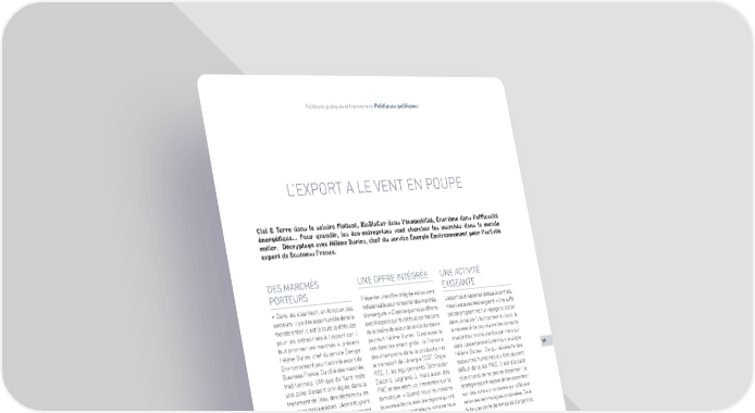 Politiques publiques et financement- Politiques publiques L’EXPORT A LE VENT EN POUPE Ciel & Terre dans le solaire flottant, BlaBlaCar dans l’écomobilité, Enertime dans l’efficacité énergétique... Pour grandir, les éco-entreprises vont chercher les marchés dans le monde entier. Décryptage avec Hélène Buriev, chef du service Énergie Environnement pour l’activité export de Business France. DES MARCHÉS UNE OFFRE INTÉGRÉE UNE ACTIVITÉ PORTEURS Présenter une offre intégrée est souvent EXIGEANTE « Dans les cleantech, en fonction des indispensable pour remporter des marchés L’export peut rapporter de beaux contrats, secteurs, il y a des opportunités dans le d’envergure. « C’est ce que nous offrons mais il est aussi très exigeant. « Il ne suffit monde entier, c’est là toute la difficulté avec Vivapolis qui réunit tous les maillons pas de programmer un voyage ou d’aller pour les entreprises à l’export car il de la chaîne de valeur de la ville durable », dans un salon. Il faut penser au suivi, à faut prioriser les marchés », prévient poursuit Hélène Buriev. C’est aussi le la nécessité de poursuivre les contacts Hélène Buriev, chef du service Énergie cas dans les smart grids : la France a en allant au moins une fois par mois sur Environnement pour l’activité export de des champions dans la production et place : l’export prend du temps », souligne Business France. Du côté des marchés le transport de l’énergie (EDF, Engie, Hélène Buriev. Ce qui nécessite des 17 traditionnels, l’Afrique du Nord reste RTE…), les équipements (Schneider ressources humaines qui font souvent une zone d’export privilégiée dans le Electric, Legrand…), mais aussi des défaut dans les PME. Il est d’autant traitement de l’eau, des déchets ou les PME et des start-up innovantes sur la plus crucial de ne pas se disperser : la énergies renouvelables. L’Asie a toujours domotique. « Quand nous réunissons stratégie export impose de se concentrer des besoins très importants, notamment tous ces acteurs, avec les régions qui ont sur des zones prioritaires qui diffèrent la Chine malgré le ralentissement lancé des démonstrateurs, comme nous selon les technologies proposées. Cela économique. La création d’éco-quartiers, l’avons fait à Vienne lors de l’European évite une perte de temps et d’argent et comme dans les villes de Chengdu ou Utility Week en novembre dernier, nous un résultat décevant. Wuhan, offre des opportunités dans mettons en avant une offre complète. tous les domaines, du traitement des C’est en cela que nous nous démarquons déchets aux smart grids. L’Asie du Sud-Est de nos concurrents ». (Inde, Vietnam, Philippines…) est aussi dynamique, de même que l’Amérique latine où des appels d’offres sont organisés dans LE FINANCEMENT, les énergies renouvelables, au Mexique UN ATOUT DÉCISIF et au Brésil, par exemple. Des pays moins traditionnels pour les entreprises Beaucoup de sociétés présentent leurs françaises émergent : le Kenya ou encore produits et services à l’international, Taïwan dans l’éolien offshore. « Mais il mais n’intègrent que rarement une ne faut pas non plus oublier l’Europe, offre de financement, à la différence des notamment du Sud et de l’Est », insiste entreprises allemandes. « Arriver avec Hélène Buriev. La Pologne a des besoins une solution peut être décisif », alerte dans la valorisation des déchets, l’Italie Hélène Buriev. La France commence à dans l’efficacité énergétique pour lutter développer des outils pour appuyer ses contre des prix de l’énergie élevés... entreprises en ce sens : Bpifrance a mis en place un crédit acheteur, l’AFD offre aussi des outils (fonds Sunref)... Panorama des Cleantech 2016