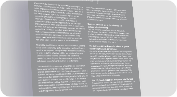 Executive summary When cost reduction leapt to the top of the corporate agenda at In this report, we examine the benefits a growing number of the height of the financial crisis, supply chains — which typically CFOs are realizing for their organization as they increasingly hold a large proportion of many companies’ costs — were one of partner with the supply chain leader. We also explore what the first places that CFOs turned to for savings. Cost efficiency business partnering means and how, in practical terms, the has since remained high on the corporate agenda but, as CFO can collaborate with the supply chain leader to improve companies get used to navigating ongoing economic corporate performance. uncertainty, financial market volatility, the impacts of globalization and an unrelenting pace of change, the supply Business partners are in the minority, but chain has taken on a new strategic significance. A supply chain collaboration is growing strategy that is aligned with the broader corporate and financial Only 26% of finance executives and 21% of supply chain goals of the business is essential. An efficient supply chain executives say that the CFO’s contribution to the supply chain that enables companies to respond to new market-growth is primarily based around an enabling, collaborative business opportunities is also paramount. As such, the role of the partnering role. However, 70% of CFOs and 63% of supply supply chain leader has become more prominent, and they chain leaders say that their relationship has become more now often sit on executive boards as peers to the CFO. collaborative over the past three years. Meanwhile, the CFO’s role has also been transformed. Leading The business partnering model relates to growth CFOs’ contributions now go far beyond the traditional finance and strong financial performance remit to encompass a strong strategic and commercial focus.2 Companies with evidence of strong business partnering between In order to do this effectively, CFOs are collaborating more the CFO and the supply chain leaders report better results than closely with other internal functions — not just from a those with a traditional finance model in place. They are more monitoring, reporting and risk management perspective, likely to report closer alignment between finance and the supply but also as supporters and enablers of performance. chain functions, and a mutual understanding of key risks and opportunities. Business partnering models have a stronger The result of this convergence is that CFOs and supply chain association with growth. Among business partner respondents, leaders are working increasingly together to understand, 48% report earnings before interest, taxes, depreciation and analyze and address supply chain issues. In companies where a amortization (EBITDA) growth increases of more than 5% in business partnering model is established, CFOs are drawing on their company over the past year, compared with just 22% of their unique, fact-based view of the organization to identify and those with a more traditional relationship. solve business problems, and provide insight to deliver more informed decision-making. Together, CFOs and supply chain The US, South Korea and Singapore take the lead leaders are creating alignment between strategy, finance, tax From country to country, there are significant differences in the and operations, unlocking hidden value within the organization proportion of supply chain leaders and CFOs with a business and strengthening financial performance. partnering relationship in place. While the US, South Korea and Singapore top the list, Western Europe makes up the tail, 2 The DNA of the CFO: a study of what makes a chief financial officer, EY, 2010. 4 Partnering for performance Part 1: the CFO and the supply chain