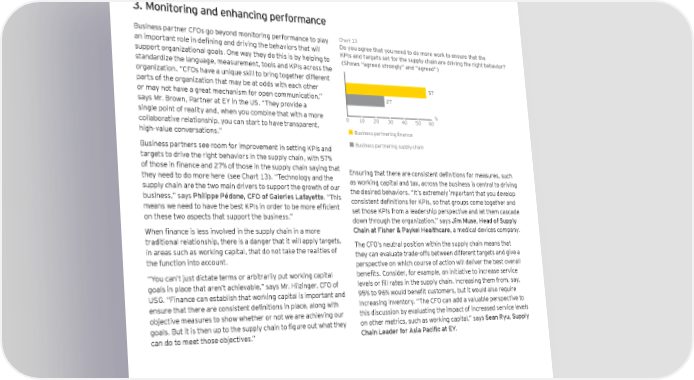 3. Monitoring and enhancing performance Business partner CFOs go beyond monitoring performance to play Chart 13 an important role in defining and driving the behaviors that will Do you agree that you need to do more work to ensure that the support organizational goals . One way they do this is by helping to KPIs and targets set for the supply chain are driving the right behavior? Please indicate whether you agree with the following statements (percentage) (Shows “agreed strongly” and “agreed”) standardize the language, measurement, tools and KPIs across the organization . “CFOs have a unique skill to bring together different parts of the organization that may be at odds with each other 57 or may not have a great mechanism for open communication,” 27 says Mr . Brown, Partner at EY in the US . “They provide a single point of reality and, when you combine that with a more % 0 10 20 30 40 50 60 collaborative relationship, you can start to have transparent, high-value conversations.” Business partnering finance Business partners see room for improvement in setting KPIs and Business partnering supply chain targets to drive the right behaviors in the supply chain, with 57% of those in finance and 27% of those in the supply chain saying that Ensuring that there are consistent definitions for measures, such they need to do more here (see Chart 13). “Technology and the as working capital and tax, across the business is central to driving supply chain are the two main drivers to support the growth of our the desired behaviors . “It’s extremely important that you develop business,” says Philippe Pédone, CFO of Galeries Lafayette . “This consistent definitions for KPIs, so that groups come together and means we need to have the best KPIs in order to be more efficient set those KPIs from a leadership perspective and let them cascade on these two aspects that support the business .” down through the organization,” says Jim Muse, Head of Supply When finance is less involved in the supply chain in a more Chain at Fisher & Paykel Healthcare, a medical devices company . traditional relationship, there is a danger that it will apply targets, The CFO’s neutral position within the supply chain means that in areas such as working capital, that do not take the realities of they can evaluate trade-offs between different targets and give a the function into account . perspective on which course of action will deliver the best overall “You can’t just dictate terms or arbitrarily put working capital benefits. Consider, for example, an initiative to increase service goals in place that aren’t achievable,” says Mr . Hilzinger, CFO of levels or fill rates in the supply chain. Increasing them from, say, USG . “Finance can establish that working capital is important and 95% to 96% would benefit customers, but it would also require ensure that there are consistent definitions in place, along with increasing inventory . “The CFO can add a valuable perspective to objective measures to show whether or not we are achieving our this discussion by evaluating the impact of increased service levels goals. But it is then up to the supply chain to figure out what they on other metrics, such as working capital,” says Sean Ryu, Supply can do to meet those objectives .” Chain Leader for Asia Pacific at EY . 26 Partnering for performance Part 1: the CFO and the supply chain