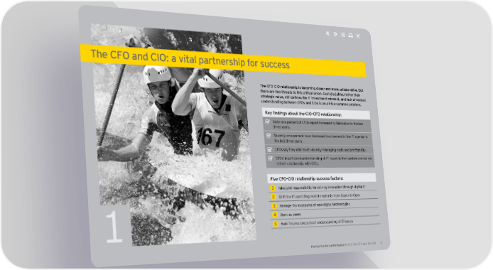 The CFO and CIO: a vital partnership for success The CFO-CIO relationship is becoming closer and more collaborative. But there are two threats to this critical union. Cost discipline, rather than strategic value, still defines the IT investment mindset, and lack of mutual understanding between CFOs and CIOs is an all-too-common problem. Key findings about the CIO-CFO relationship: Sixty-one percent of CFOs report increased collaboration in the last three years. Seventy-one percent have increased involvement in the IT agenda in the last three years. CFOs say they add most value by managing costs and profitability. CFOs’ insufficient understanding of IT issues is the number one barrier in their relationship with CIOs. Five CFO-CIO relationship success factors: 1 Take joint responsibility for driving innovation through digital IT 2 Shift the IT operating model emphasis from Capex to Opex 3 Manage risk exposures of new digital technologies 4 Work as peers 5 Build finance executives’ understanding of IT issues 1 Partnering for performance Part 3: the CFO and the CIO 4