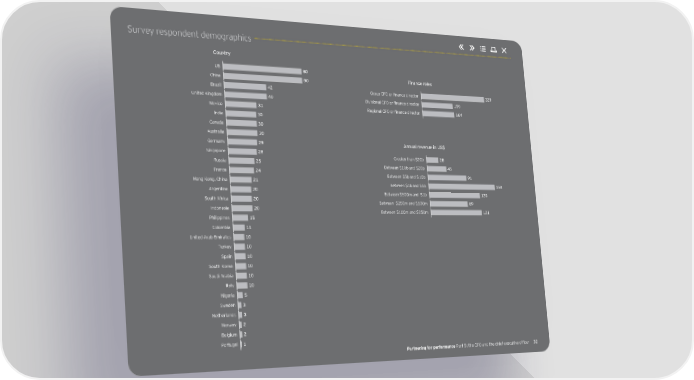 Survey respondent demographics Country US 80 Finance roles China 80 Brazil 42 Group CFO or finance director 329 United Kingdom 40 Divisional CFO or finance director 159 Mexico 31 Regional CFO or finance director 164 India 30 Canada 30 Australia 30 Germany 29 Annual revenue in US$ Singapore 28 Greater than $20b 28 Russia 25 Between $10b and $20b 45 France 24 Between $5b and $10b 91 Hong Kong, China 21 Between $1b and $5b 158 Argentina 20 Between $500m and $1b 120 South Africa 20 Between $250m and $500m 89 Indonesia 20 Between $100m and $250m 121 Philippines 15 Colombia 11 United Arab Emirates 10 Turkey 10 Spain 10 South Korea 10 Saudi Arabia 10 Italy 10 Nigeria 5 Sweden 3 Netherlands 3 Norway 2 Belgium 2 Portugal 1 Partnering for performance Part 5: the CFO and the chief executive officer 32
