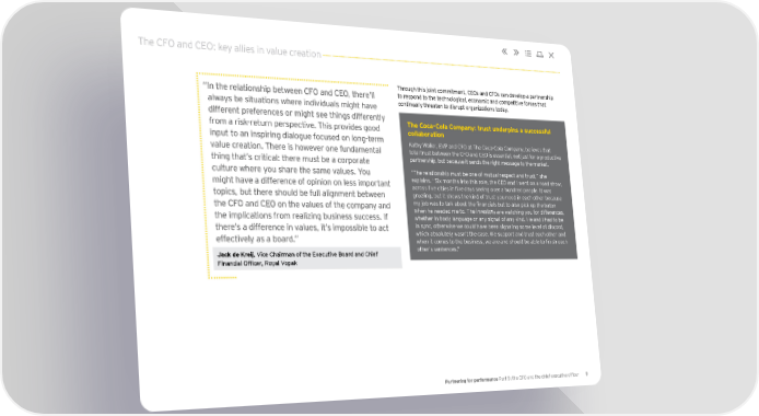The CFO and CEO: key allies in value creation Through this joint commitment, CEOs and CFOs can develop a partnership “ In the relationship between CFO and CEO, there’ll to respond to the technological, economic and competitive forces that always be situations where individuals might have continually threaten to disrupt organizations today. different preferences or might see things differently The Coca-Cola Company: trust underpins a successful from a risk-return perspective. This provides good collaboration input to an inspiring dialogue focused on long-term Kathy Waller, EVP and CFO at The Coca-Cola Company, believes that value creation. There is however one fundamental total trust between the CFO and CEO is essential, not just for a productive thing that’s critical: there must be a corporate partnership, but because it sends the right message to the market. culture where you share the same values. You “The relationship must be one of mutual respect and trust,” she might have a difference of opinion on less important explains. “Six months into this role, the CEO and I went on a road show, across five cities in five days seeing over a hundred people. It was topics, but there should be full alignment between grueling, but it shows the kind of trust you need in each other because the CFO and CEO on the values of the company and my job was to talk about the financials but to also pick up the baton the implications from realizing business success. If when he needed me to. The investors are watching you for differences, whether in body language or any signal of any kind. He and I had to be there’s a difference in values, it’s impossible to act in sync, otherwise we could have been signaling some level of discord, effectively as a board.” which absolutely wasn’t the case. We support and trust each other and when it comes to the business, we are and should be able to finish each Jack de Kreij, Vice Chairman of the Executive Board and Chief other’s sentences.” Financial Officer, Royal Vopak Partnering for performance Part 5: the CFO and the chief executive officer 9