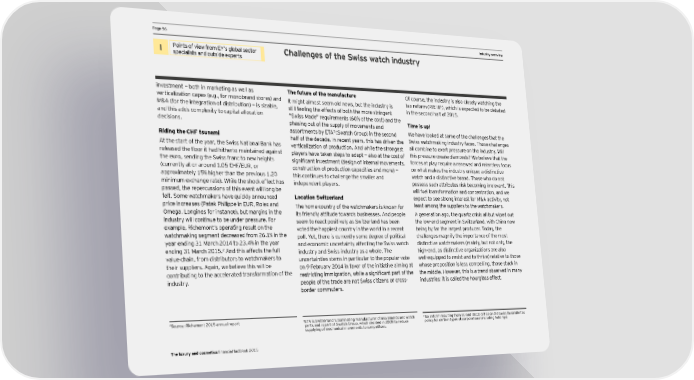 PPage 56age 56 DCF and valuation pIndustry oaramevervieterws I Points of view from EY’s global sector Challenges of the Swiss watch industry specialists and outside experts investment — both in marketing as well as The future of the manufacture Of course, the industry is also closely watching the tax reform (RIE III4 verticalization capex (e.g., for monobrand stores) and It might almost seem old news, but the industry is ), which is expected to be debated M&A (for the integration of distribution) — is sizable, still feeling the effects of both the more stringent in the second half of 2015. and this adds complexity to capital allocation “Swiss Made” requirements (60% of the cost) and the decisions. phasing out of the supply of movements and Time is up! 3 We have looked at some of the challenges that the Riding the CHF tsunami assortments by ETA (Swatch Group) in the second half of the decade. In recent years, this has driven the Swiss watchmaking industry faces. Those challenges At the start of the year, the Swiss National Bank has verticalization of production. And while the strongest all combine to exert pressure on the industry. Will released the floor it had hitherto maintained against players have taken steps to adapt — also at the cost of this pressure create diamonds? We believe that the the euro, sending the Swiss franc to new heights significant investment (design of internal movements, forces at play require a renewed and relentless focus (currently at or around 1.05 CHF/EUR, or construction of production capacities and more) — on what makes the industry unique: a distinctive approximately 15% higher than the previous 1.20 this continues to challenge the smaller and watch and a distinctive brand. Those who do not minimum exchange rate). While the shock effect has independent players. possess such attributes risk becoming irrelevant. This passed, the repercussions of this event will long be will fuel transformation and concentration, and we felt. Some watchmakers have quickly announced Location Switzerland expect to see strong interest for M&A activity, not price increases (Patek Philippe in EUR, Rolex and The home country of the watchmakers is known for least among the suppliers to the watchmakers. Omega, Longines for instance), but margins in the its friendly attitude towards businesses. And people A generation ago, the quartz crisis all but wiped out industry will continue to be under pressure. For seem to react positively as Switzerland has been the low-end segment in Switzerland, with China now example, Richemont’s operating result on the voted the happiest country in the world in a recent being by far the largest producer. Today, the watchmaking segment decreased from 26.1% in the poll. Yet, there is currently some degree of political challenges magnify the importance of the most year ending 31 March 2014 to 23.4% in the year and economic uncertainty affecting the Swiss watch distinctive watchmakers (mainly, but not only, the ending 31 March 2015.2 And this affects the full industry and Swiss industry as a whole. The high-end, as distinctive organizations are also value chain, from distributors to watchmakers to uncertainties stems in particular to the popular vote well-equipped to resist and to thrive) relative to those their suppliers. Again, we believe this will be on 9 February 2014 in favor of the initiative aiming at whose proposition is less compelling, those stuck in contributing to the accelerated transformation of the restricting immigration, while a significant part of the the middle. However, this is a trend observed in many industry. people of the trade are not Swiss citizens or cross- industries; it is called the hourglass effect. border commuters. 2Source: Richemont 2015 annual report 3 4 ETA is Switzerland’s dominating manufacturer of movements and watch Tax reform resulting from EU and OECD critics on the Swiss favorable tax parts and is part of Swatch Group, which decided in 2009 to reduce policy for certain types of corporations (including holdings) supplying of mechanical movements to competitors. The luxury and cosmetics financial factbook 2015