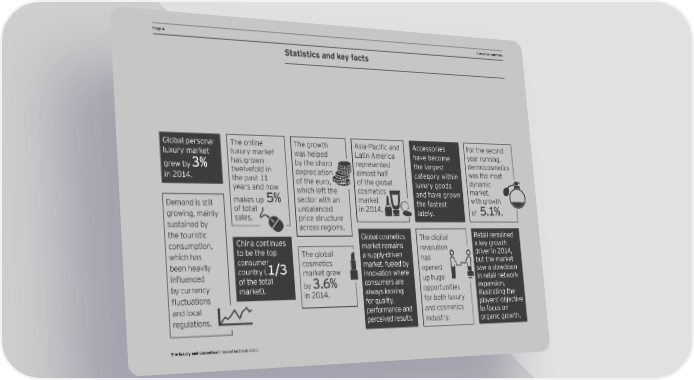 Page 4 Executive summary Statistics and key facts Global personal The online The growth Asia-Pacific and Accessories For the second luxury market luxury market was helped Latin America have become year running, grew by3% has grown by the sharp represented the largest dermocosmetics in 2014. twelvefold in depreciation almost half category within was the most the past 11 of the euro, of the global luxury goods dynamic years and now which left the cosmetics and have grown market, 5% sector with an market with growth Demand is still makes up the fastest growing, mainly of total unbalanced in 2014. lately. of 5.1%. sustained by sales. price structure the touristic across regions. China continues Global cosmetics The digital Retail remained consumption, to be the top market remains revolution a key growth which has The global a supply-driven has driver in 2014, been heavily consumer cosmetics market, fueled by but the market country ( opened saw a slowdown influenced 1/3 market grew innovation where of the total by consumers are up huge in retail network by currency market). 3.6% always looking opportunities expansion, fluctuations in 2014. for quality, for both luxury illustrating the and local performance and and cosmetics players’ objective regulations. perceived results. industry. to focus on organic growth. The luxury and cosmetics financial factbook 2015