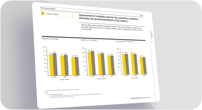 DCF and valuation parameters Page 25 E Trading multiples Improvement of multiples level for the cosmetics companies illustrates the growing dynamism of the industry • Trading multiples of the cosmetics companies are globally in line with those of the luxury industry, even with slightly higher figures for EBITDA multiples, illustrating analysts’ expectations for margins to improve in the next years. s er aluationt ame ar p DCF and v EV/sales (FY14A/E-16E) EV/EBITDA (FY14A/E-16E) Price to earnings (FY14A/E-16E) 3.5x 18.0x 35.0x 15.6x 16.0x 3.0x 2.8x 14.4x 14.8x 30.0x 27.7x 28.5x 28.9x 28.3x 15.0x 2.6x 2.5x 2.6x 13.0x 13.3x 2.5x 2.3x 2.3x 25.0x 24.4x 23.9x 12.0x 2.0x 20.0x 9.0x 1.5x 15.0x 6.0x 1.0x 10.0x 0.5x 3.0x 5.0x 0 0 0 2014A/E 2015E 2016E 2014A/E 2015E 2016E 2014A/E 2015E 2016E Average Median Average Median Average Median Source: Data based on consensus of several brokers reports for each company Notes: • The trading multiples are based on: • Fixed EV computed as market capitalization as of 31 March 2015 (one-month average) and latest-available net financial debt • Projections estimated by analysts for successive years The luxury and cosmetics financial factbook 2015