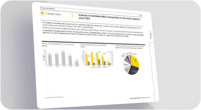 DCF and valuation parameters Page 31 F Transaction multiples Analysis of worldwide M&A transactions in the luxury industry since 2011 • The number of completed deals on global scale is still significant, despite the financial crisis. The M&A activity from both strategic and financial investors in the industry experienced a strong first quarter in 2015 with 18 completed deals. • PE activity was intense and stable during the past years, showing an always-stronger interest for the industry, confirmed through the creation of dedicated funds. s er aluationt • As presented in the graph about the top 10 markets by the number of completed deals over the FY11-1Q15 period, Italy turns out to be the first country as a target ame ar nationality, proving the attractiveness of Italian companies for investors (investors’ interest for ‘‘made in Italy’’ and brands’ high quality). p DCF and v Number of completed deals in the luxury industry Number of completed deals by type of buyer Number of completed deals sorted by nationality of the (global) (global) target over FY11–1Q15 (among the top 10 markets) 70 62 50 32% 35% 45 44 42 33% Germany 60 52 37 30% 30% HK China Netherlands 48 40 1% 2% 1% 1% 50 44 s35 31 25% India s l l a 23% a40 e30 3% e d 20% d f25 f o 20 o . 15% UK 30 o 15% . 20 Italy o 18 N 13 8% N20 15 11 12 10% 30% 10 8 6 10 5 5% 0 0 0% Switzerland FY11 FY12 FY13 FY14 1Q15 FY11 FY12 FY13 FY14 1Q15 14% Corporate PE PE/total France 12% United States 28% Source: Capital IQ, Mergermarket, Factiva The luxury and cosmetics financial factbook 2015