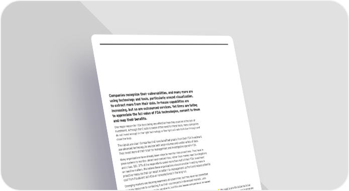 Companies recognize their vulnerabilities, and many more are using technology and tools, particularly around visualization, to extract more from their data. In-house capabilities are increasing, but so are outsourced services. Yet firms are failing to appreciate the full value of FDA technologies, commit to them and reap their benefits. One major reason for FDA tools being less effective than they could be is the lack of investment. Although the C-suite is aware of the need for these tools, many companies do not invest enough in the right technology or the right skill sets to follow through and close the loop. The signals are clear. Companies that have benefited greatly from their FDA investment use advanced technology to analyze both large volumes and a wide variety of data. They invest more of their total risk management and investigative spend in FDA. Many organizations have already taken steps to monitor risks proactively. They have in place systems to monitor, detect and combat risks, rather than merely react to allegations and crises. Still, 37% of the respondents spend more than half of their FDA investment on reactive matters. We believe these organizations should consider investing more in proactive measures that can result in better risk management up front and reduce potential cost from fraudulent activities or noncompliance in the long run. Emerging markets are showing awareness of cybercrime, but they have not committed as many resources to combating it as their counterparts in developed markets. Lack of funding appears to be a major constraint, but this also leaves companies at increased risk of an attack. The final picture of FDA in 2016 is of a technology that is slowly gaining traction and “ We need to provide better technical beginning to yield returns on investment. But companies have not yet thrown their full training to our people and improve the weight behind the paradigm, choosing instead to invest piecemeal and reap only some quality of information in our corporate of the benefits. In order to leverage the full power of FDA, firms need to commit, invest systems and applications.” 5and implement the strategy in its entirety. In doing so, they will join those that are already Risk Executive, Life Sciences, Brazil riding the crest of the analytics revolution. 37% of the respondents spend more than half of their FDA investment on reactive matters. Global Forensic Data Analytics Survey 2016 | 33