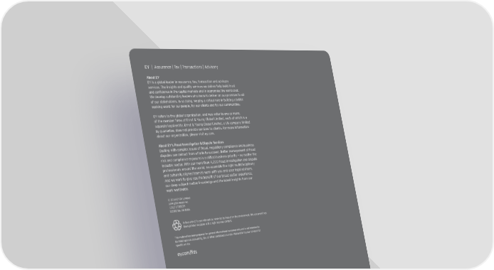 EY | Assurance | Tax | Transactions | Advisory About EY EY is a global leader in assurance, tax, transaction and advisory services. The insights and quality services we deliver help build trust and confidence in the capital markets and in economies the world over. We develop outstanding leaders who team to deliver on our promises to all of our stakeholders. In so doing, we play a critical role in building a better working world for our people, for our clients and for our communities. EY refers to the global organization, and may refer to one or more, of the member firms of Ernst & Young Global Limited, each of which is a separate legal entity. Ernst & Young Global Limited, a UK company limited by guarantee, does not provide services to clients. For more information about our organization, please visit ey.com. About EY’s Fraud Investigation & Dispute Services Dealing with complex issues of fraud, regulatory compliance and business disputes can detract from efforts to succeed. Better management of fraud risk and compliance exposure is a critical business priority — no matter the industry sector. With our more than 4,200 fraud investigation and dispute professionals around the world, we assemble the right multidisciplinary and culturally aligned team to work with you and your legal advisors. And we work to give you the benefit of our broad sector experience, our deep subject matter knowledge and the latest insights from our work worldwide. © 2016 EYGM Limited All Rights Reserved. 1512-1788039 SCORE No. AU3666 In line with EY’s commitment to minimize its impact on the environment, this document has been printed on paper with a high recycled content. This material has been prepared for general informational purposes only and is not intended to be relied upon as accounting, tax, or other professional advice. Please refer to your advisors for specific advice. ey.com/fids