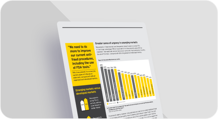 “ We need to do Greater sense of urgency in emerging markets Respondents in these markets have the greatest sense of urgency to adopt FDA. more to improve A much larger percentage (78%) of respondents from these markets agree with the statement: “We need to do more to improve our current anti-fraud procedures, including our current anti- the use of FDA tools,” compared with 65% of organizations in developed markets. fraud procedures, including the use Figure 10: Perceived effectiveness by country of FDA tools.” 88% 83% 78% 78% 78% 78% of respondents from emerging 75% markets agree with the above 73% 70% statement, compared with 65% of 68%65% 65% organizations in developed markets. 63%60% 60% 58% 55% Emerging markets versus developed markets Respondents using FDA to Mexico India Brazil China / Hong KongAustraliaSouth AfricaJapanUKIrelandUAEUS France SingaporeGermanyItaly Switzerland 66% 72% actively address cyber breach or Developed markets Emerging markets insider threat �▀ ▀ Q. To what extent do you agree that “We need to do more to improve our current anti-fraud procedures, including the use of FDA tools”? Base: All respondents (665) Respondents The sense of urgency, however, is focused more on using FDA to combat traditional fraud, 48% 59% saying their such as bribery and corruption, than to address cybercrime or insider threat. Only 66% budget is of respondents in emerging markets are using FDA to actively address cyber breaches “sufficient” or internal threats, compared with 72% in developed markets. This is not to suggest that organizations in emerging markets don’t realize the potential for FDA to manage cyber and insider risks. On the contrary, 79% of emerging markets respondents think that FDA Respondents could play a significant role in combating cyber and insider risks. Focusing FDA investment saying they on more traditional fraud risks is understandable given likely funding constraints and the need to improve underlying maturity of the local market. 79% 61% management Forty-eight percent of emerging markets respondents say their budget is “sufficient,” awareness of the compared with 59% of their peers in developed markets. The funding challenge is directly benefits of FDA tied to management awareness. A significant 79% of emerging markets respondents say they need to improve management awareness of the benefits of FDA, compared with 61% in developed markets. The resulting focus of FDA investment on more traditional fraud risks rather than cybercrime or internal threats appears to be due to budgets and is clearly a gap to be bridged. 79% of emerging markets “ In Asia-Pacific, we are seeing more and more companies respondents think that FDA could play a significant role in investing in advanced forensic data analytics capabilities combating cyber and insider risks. for effective compliance monitoring, as well as fraud prevention and detection.” Reuben Khoo, Principal, Forensic Technology & Discovery Services, FIDS Singapore, EY 20 | Global Forensic Data Analytics Survey 2016