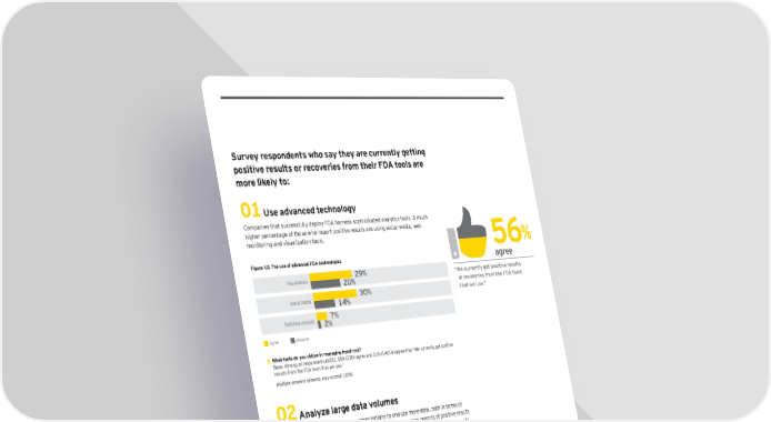 Survey respondents who say they are currently getting positive results or recoveries from their FDA tools are more likely to: 01 Use advanced technology Companies that successfully deploy FDA harness sophisticated analytics tools. A much higher percentage of those who report positive results are using social media, web monitoring and visualization tools. 56% Figure 12: The use of advanced FDA technologies agree Visualization 29% “ We currently get positive results 20% or recoveries from the FDA tools Social media 30% that we use.” 14% Statistical analysis 7% 2% Agree Disagree �▀ ▀ Q. What tools do you utilize in managing fraud risk? Base: Among all respondents (665), 56% (370) agree and 21% (140) disagree that “We currently get positive results from the FDA tools that we use.” Multiple answers allowed, may exceed 100%. 02 Analyze large data volumes More powerful analytics tools allow organizations to analyze more data, both in terms of volume and variety. Our survey shows a high correlation between reports of positive results and the use of large data volumes. Seventy-nine percent of those reporting positive results, versus 11% of those who don’t, are using more than 10 million records, which are typically outside the domain of spreadsheets and thus require more sophisticated tools for analysis. Of those who are not seeing positive results with FDA, data volume analyzed is low, with only a small minority of respondents analyzing more than 1 million records. Companies are likely to see better results from their FDA tools when they start applying them to more of their data. Figure 13: Data volume used in FDA Under 1 million 23% 53% Between 57% 1 million and 10 million 19% More than 10 million 79% 11% Agree Disagree �▀ ▀ Q. What data volume (in records) do you typically work with in your FDA tasks? Among all respondents (665), 56% (370) agree and 21% (140) disagree that “We currently get positive results from the FDA tools that we use.” Multiple answers allowed, may exceed 100%. Global Forensic Data Analytics Survey 2016 | 25