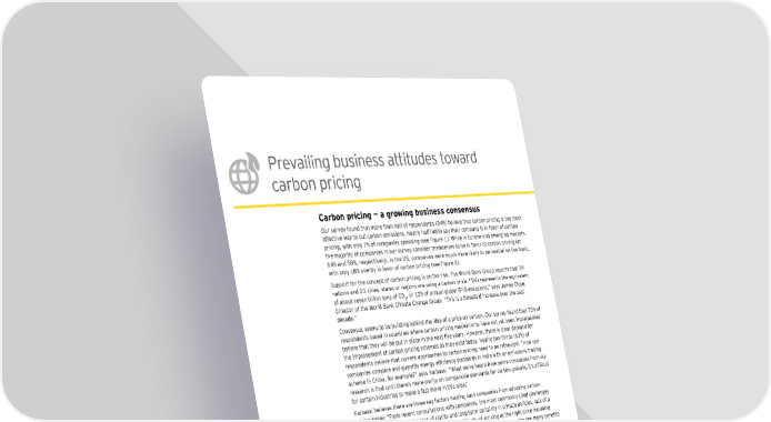 Prevailing business attitudes toward carbon pricing Carbon pricing — a growing business consensus Our survey found that more than half of respondents (54%) believe that carbon pricing is the most effective way to cut carbon emissions. Nearly half (48%) say their company is in favor of carbon pricing, with only 7% of companies opposing (see Figure 1). While in Europe and emerging markets, the majority of companies in our survey consider themselves to be in favor of carbon pricing (at 64% and 59%, respectively), in the US, companies were much more likely to be neutral on the topic, with only 18% overtly in favor of carbon pricing (see Figure 2). Support for the concept of carbon pricing is on the rise. The World Bank Group reports that 39 nations and 23 cities, states or regions are using a carbon price. “This represents the equivalent of about seven billion tons of CO , or 12% of annual global GHG emissions,” says James Close, 2 Director of the World Bank Climate Change Group. “This is a threefold increase over the past decade.” Consensus seems to be building behind the idea of a price on carbon. Our survey found that 73% of respondents based in countries where carbon pricing mechanisms have not yet been implemented believe that they will be put in place in the next five years. However, there is clear demand for the improvement of carbon pricing schemes as they exist today. Nearly two-thirds (63%) of respondents believe that current approaches to carbon pricing need to be rethought. “How can companies compare and quantify energy efficiency standards in India with an emissions trading scheme in China, for example?” asks Karbassi. “What we’ve heard from some companies from our research is that until there’s more clarity on comparable standards for carbon globally, it’s difficult for certain industries to make a fast move in this area.” Karbassi believes there are three key factors holding back companies from adopting carbon pricing today. “From recent consultations with companies, the most commonly cited challenges with carbon pricing were the lack of clarity and long-term certainty in climate policies, lack of a common method to set a carbon price, and the difficulty of arriving at the right price including competitiveness issues,” she explains. “At the same time, these companies also see many benefits such as increased support across business units for renewable investments.” Figure 1. Which of the following statements best describes your company’s position on the introduction of carbon pricing in the country where you’re personally based? 48% We are in favor of carbon pricing 45% We are neutral on the topic of carbon pricing 7% We are against carbon pricing 0 10 20 30 40 50 4 I Shifting the carbon pricing debate
