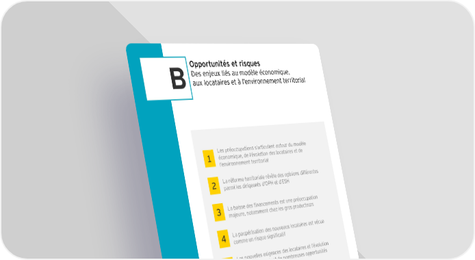 Opportunités et risques Des enjeux liés au modèle économique, Baux locataires et à l’environnement territorial Les préoccupations s’articulent autour du modèle 1 économique, de l’évolution des locataires et de l’environnement territorial 2 La réforme territoriale révèle des opinions différentes parmi les dirigeants d’OPH et d’ESH 3 La baisse des financements est une préoccupation majeure, notamment chez les gros producteurs 4 La paupérisation des nouveaux locataires est vécue comme un risque significatif Les nouvelles exigences des locataires et l’évolution 5 de leur profil portent de nombreuses opportunités pour les bailleurs
