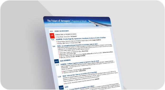 The Future of Aerospace | Programme en français 9 avril 2015, Cercle de l’Union Interalliée, Paris 8.30 ACCUEIL DES PARTICIPANTS 9.00 INTRODUCTION DU PRESIDENT DE SEANCE ➤ Simon Wright, Industry Editor, The Economist 9.15 OUVERTURE : Directive Single Sky, réglementation internationale et croissance du secteur aéronautique ➤ Margus Rahuoja, Director for Aviation and International Transport Affairs, DG MOVE, European Commission ➤ Boubacar Djibo, Director, Air Transport Bureau, ICAO 9.45 PANEL : Les compagnies aériennes d’aujourd’hui et les business models de demain Malgré la forte croissance de l’industrie et du nombre de passagers, les compagnies aériennes parviennent difficilement à assurer des marges supérieures à 1%. Les compagnies aériennes du Moyen-Orient bousculent le marché du long-courrier, alors que les low-costs se sont imposées sur le court-courrier. Comment répondre à ces défis et créer de la croissance ? ➤ James Hogan, President and Chief Executive Officer, Etihad Airways ➤ Brian Pearce, Chief Economist, IATA ➤ Karl Ulrich Garnadt, Member of the Executive Board, Deutsche Lufthansa AG and Chief Executive Officer, Lufthansa German Airlines ➤ Bjørn Kjos, Chief Executive Officer, Norwegian Air Shuttle 10.45 PAUSE NETWORKING 11.15 INTERVIEW : Améliorer l’expérience passager en repensant la façon de voyager Jusqu’où le processus d’enregistrement peut-il être automatisé ? Comment intégrer les nouvelles technologies—passeports biométriques, étiquettes RFID…—dans une chaîne continue ? Comment évaluer l’efficacité et le ROI de tels systèmes ? Le passager de demain pourra-t-il concevoir son propre vol ? ➤ Augustin de Romanet, Chief Executive Officer, Aéroports de Paris ➤ Temel Kotil, Chief Executive Officer, Turkish Airlines 11.50 FOCUS : Voler sans fuel ? Zoom sur une aviation verte et économique Avionneurs et compagnies aériennes doivent développer des avions plus efficaces afin d’en diminuer le poids et les coûts. Quelles sont les dernières innovations permettant de construire des avions plus légers et efficaces ? Quelles sont les dernières tendances du marché ? Quel sera l’impact des évènements au Moyen-Orient, en Afrique et en Russie sur les prix du pétrole ? ➤ Ross Mitchell, Vice-president, Business Acquisition Commercial Aircraft, Bombardier 12.25 LUNCH 14.00 PANEL : Repenser l’industrie aérospatiale et de la défense Le marché de l’aérospatial et de la défense est chamboulé : la demande est mondialisée et poussée par le Moyen-Orient, les gouvernements coupent les budgets, et les banques accordent moins de prêts. Quels nouveaux business models émergent face à cet impératif d’innovation et de diversification ? Les technologies telles que les drones réduiront-elles le fossé entre activités civiles et militaires ? Quels sont les nouveaux instruments de financement ? ➤ Introduction par : Nour-Eddine Zanouda, Aerospace and Defense leading Partner – France, Maghreb and Luxemburg, EY ➤ Nelson Salgado, Vice-president of Institutional Relations and Sustainability, Embraer ➤ Patrick Auroy, Assistant Secretary General for Defence Investment, NATO ➤ Tony Wood, President, Aerospace, Rolls Royce L’innovation dans l’aviation en 2020 15.00 DISCOURS : ➤ Yann Barbaux, Senior Vice-president Innovation, Airbus 15.15 PAUSE CAFE 15.45 PANEL : Construire des supply chains sans failles dans un environnement global complexe Alors que les carnets de commandes explosent, les fournisseurs font face à des contraintes de capacité et de coûts. Quel sera le nouveau visage de la supply chain de demain ? L’investissement pourra-t-il tenir le rythme de la croissance ? Comment limiter les risques à chaque étape de la supply chain ? Comment préserver son avantage compétitif alors qu’un certain nombre de transferts de technologies sont également nécessaires ? ➤ Michel Tellier, Vice-president Aerospace & Defense Industry, Dassault Systemes ➤ Marcus Bryson, Chief Executive Aerospace and Landsystems, GKN Aerospace ➤ Frédéric Michelland, Chief Executive Officer, Latécoère 16.30 ZOOM : L’espace, les satellites, et l’investissement privé Longtemps réservée aux Etats en quête de pouvoir et de prestige, la conquête de l’espace relève maintenant du secteur privé : c’est lui qui envoi les satellites en orbite. Quelles collaborations avec les gouvernements, les fournisseurs d’internet et le secteur des télécommunications ? Les fusées peuvent-elle être réutilisées ? Qui se chargera de nettoyer l’espace pollué par les débris ? ➤ Jim Simpson, Vice-president, Business Development and Chief Strategist, Network & Space Systems, Boeing 16.45 DISCOURS DE CLÔTURE 17.00 CONCLUSION DU PRESIDENT DE SEANCE