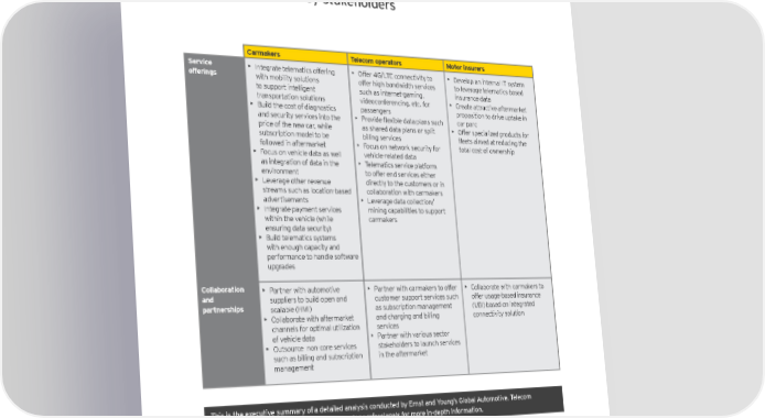 Considerations for key stakeholders Carmakers Telecom operators Motor insurers Service • Integrate telematics offering • Offer 4G/LTE connectivity to • Develop an internal IT system offerings with mobility solutions offer high bandwidth services to leverage telematics-based to support intelligent such as internet-gaming, insurance data transportation solutions videoconferencing, etc. for • Create attractive aftermarket • Build the cost of diagnostics passengers proposition to drive uptake in and security services into the • Provide flexible data plans such car parc price of the new car, while as shared data plans or split • Offer specialized products for subscription model to be billing services fleets aimed at reducing the followed in aftermarket • Focus on network security for total cost of ownership • Focus on vehicle data as well vehicle-related data as integration of data in the • Telematics service platform environment to offer end services either • Leverage other revenue directly to the customers or in streams such as location-based collaboration with carmakers advertisements • Leverage data collection/ • Integrate payment services mining capabilities to support within the vehicle (while carmakers ensuring data security) • Build telematics systems with enough capacity and performance to handle software upgrades Collaboration • Partner with automotive • Partner with carmakers to offer • Collaborate with carmakers to and suppliers to build open and customer support services such offer usage-based insurance partnerships scalable (HMI) as subscription management (UBI) based on integrated • Collaborate with aftermarket and charging and billing connectivity solution channels for optimal utilization services of vehicle data • Partner with various sector • Outsource non-core services stakeholders to launch services such as billing and subscription in the aftermarket management This is the executive summary of a detailed analysis conducted by Ernst and Young’s Global Automotive, Telecom and Insurance Centers. Please contact our sector professionals for more in-depth information.