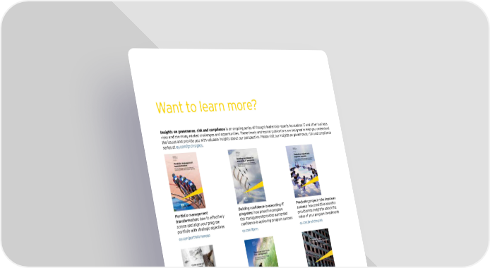 Want to learn more? Insights on governance, risk and compliance is an ongoing series of thought leadership reports focused on IT and other business risks and the many related challenges and opportunities. These timely and topical publications are designed to help you understand the issues and provide you with valuable insights about our perspective. Please visit our Insights on governance, risk and compliance series at ey.com/grcinsights. Portfolio management Building confidence in executing IT Predicting project risks improves transformation: how to effectively programs: how proactive program success: how predictive analytics screen and align your program risk management provides warranted provides the insight to unlock the portfolio with strategic objectives confidence in achieving program success value of your program investments ey.com/portfoliomanage ey.com/itprm ey.com/predictingrisk Cyber program management: Expecting more from risk Maximizing value from your lines of identifying ways to get ahead management: drive business results defense: a pragmatic approach to of cybercrime through harnessing uncertainty establishing and optimizing your LOD model ey.com/cpm ey.com/repm ey.com/lod Get ahead of cybercrime: Centralized operations: the future Building trust in the cloud: EY’s Global Information of operating models for Risk, creating confidence in your Security Survey 2014 Control and Compliance functions cloud ecosystem ey.com/giss ey.com/centralops ey.com/cloudtrust 16 | Unlocking the value of your program investments