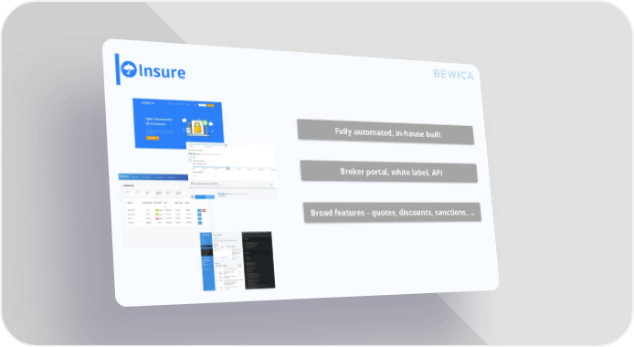 Insure Fully automated, in-house built Broker portal, white label, API Broad features – quotes, discounts, sanctions, …