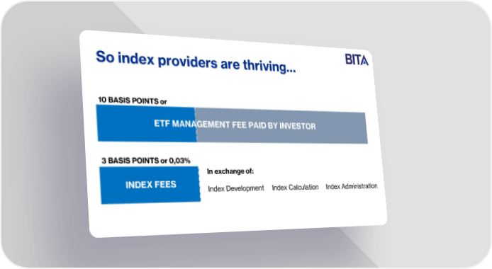 BITA - Pitch Deck Page 2 Page 4So index providers are thriving… 10 BASIS POINTS or 0,07% ETF MANAGEMENT FEE PAID BY INVESTOR 3 BASIS POINTS or 0,03% In exchange of: INDEX FEES Index Development Index Calculation Index Administration