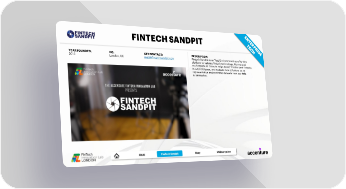 FINTECH SANDPIT YEAR FOUNDED: HQ: KEY CONTACT: DESCRIPTION: 2019 London, UK [email protected] Fintech Sandpit is an Test-Environmennt-as-a-Service platform to validate fintech technology. Our curated marketplace of fintechs helps banks find the best fintechs, build prototypes, and evaluate new solutions using representative and synthetic datasets from our data supermarket. CEREBRON ChAI FinTech Sandpit Hazy USEncryption