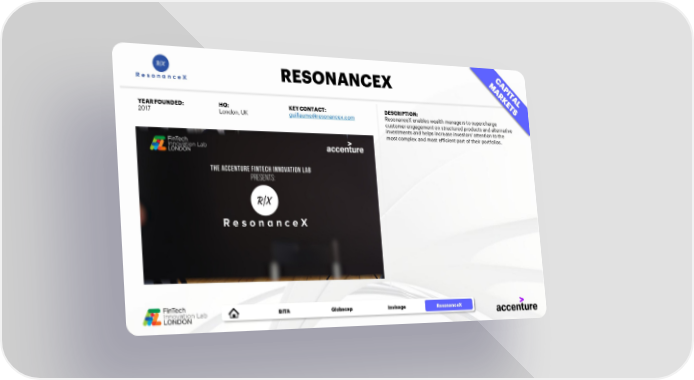 RESONANCEX YEAR FOUNDED: HQ: KEY CONTACT: DESCRIPTION: 2017 London, UK [email protected] ResonanceX enables wealth managers to supercharge customer engagement on structured products and alternative investments and helps increase investors' attention to the most complex and most efficient part of their portfolios. BITA CEREBRON Globacap Invisage ResonanceX