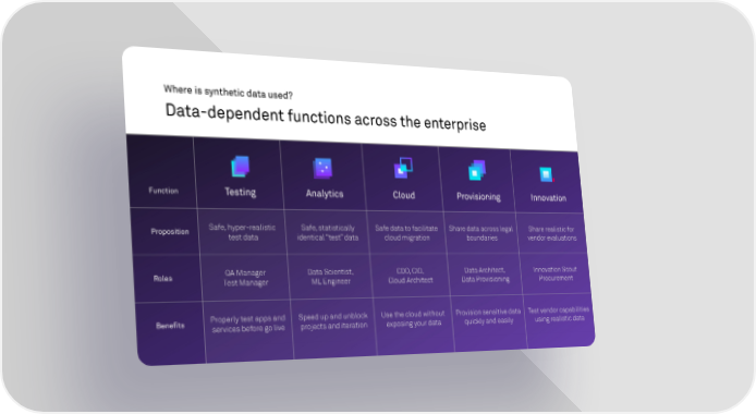 Where is synthetic data used? Data-dependent functions across the enterprise Function Testing Analytics Cloud Provisioning Innovation Proposition Safe, hyper-realistic Safe, statistically Safe data to facilitate Share data across legal Share realistic for test data identical “test” data cloud migration boundaries vendor evaluations Roles QA Manager Data Scientist, CDO, CIO, Data Architect, Innovation Scout Test Manager ML Engineer Cloud Architect Data Provisioning Procurement Benefits Properly test apps and Speed up and unblock Use the cloud without Provision sensitive data Test vendor capabilities services before go live projects and iteration exposing your data quickly and easily using realistic data