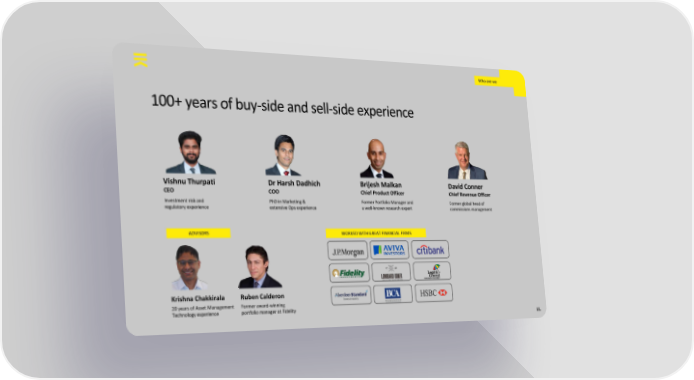 Who are we 100+ years of buy-side and sell-side experience Vishnu Thurpati Dr Harsh Dadhich Brijesh Malkan David Conner CEO COO Chief Product Officer Chief Revenue Officer Investment risk and PhD in Marketing & Former Portfolio Manager and Former global head of regulatory experience extensive Ops experience a well-known research expert commissions management ADVISORS WORKED WITH GREAT FINANCIAL FIRMS Krishna Chakkirala Ruben Calderon 20 years of Asset Management Former award-winning Technology experience portfolio manager at Fidelity 11.