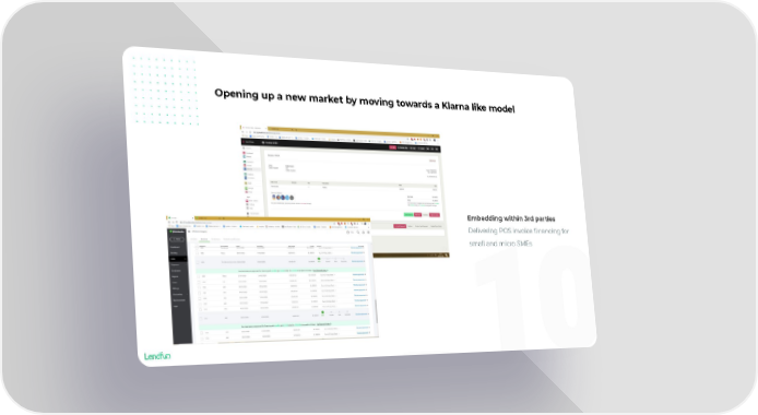 Lendflo - Pitch Deck Page 9 Page 11Opening up a new market by moving towards a Klarna like model Embedding within 3rd parties Delivering POS invoice financing for small and micro SMEs 10